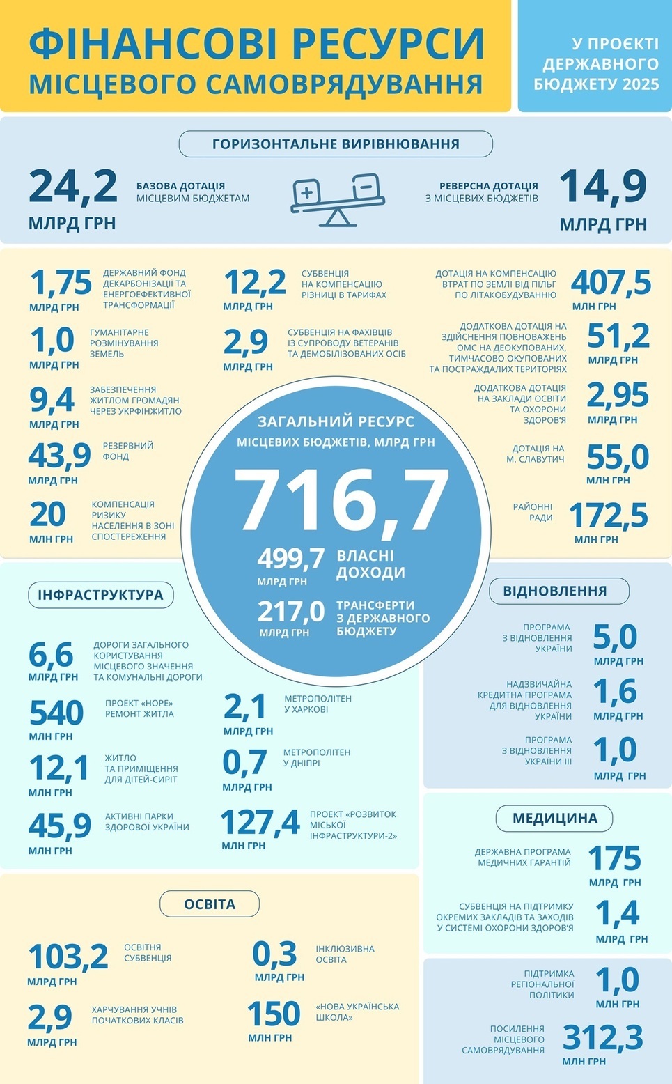 Згідно з розрахунками Уряду, загальний обсяг фінансового ресурсу місцевих бюджетів на 2025 рік становитиме 716,7 млрд грн, в тому числі: