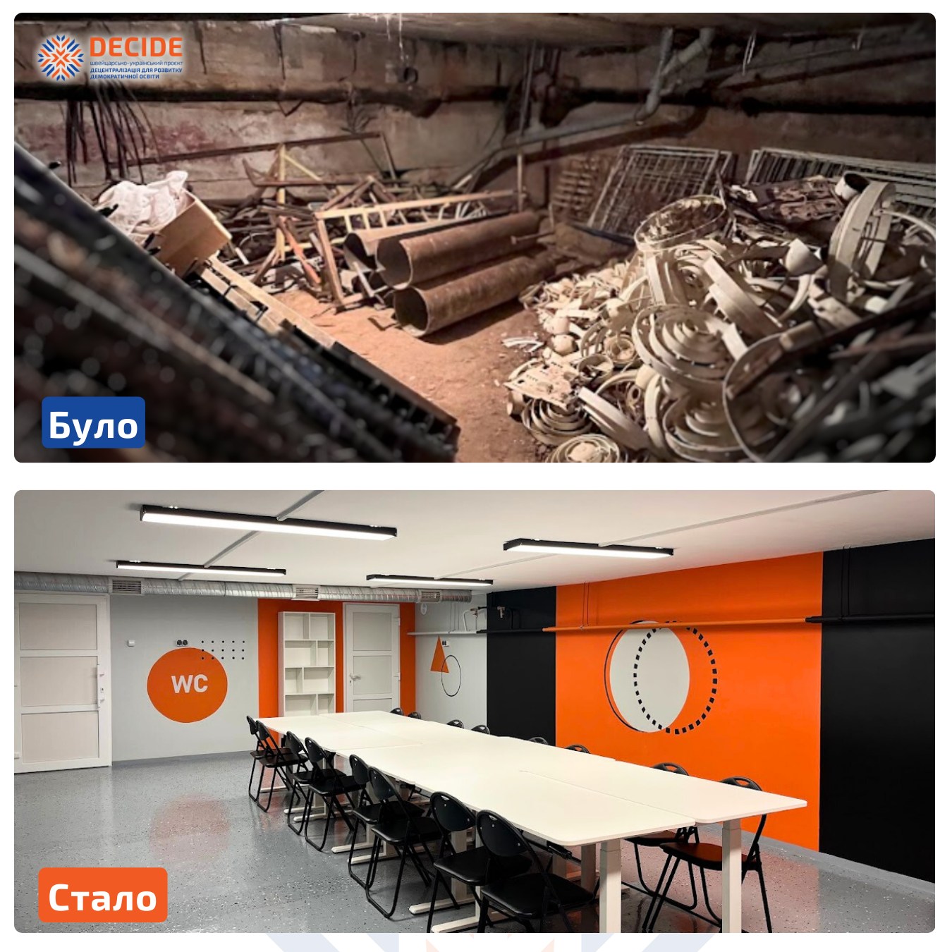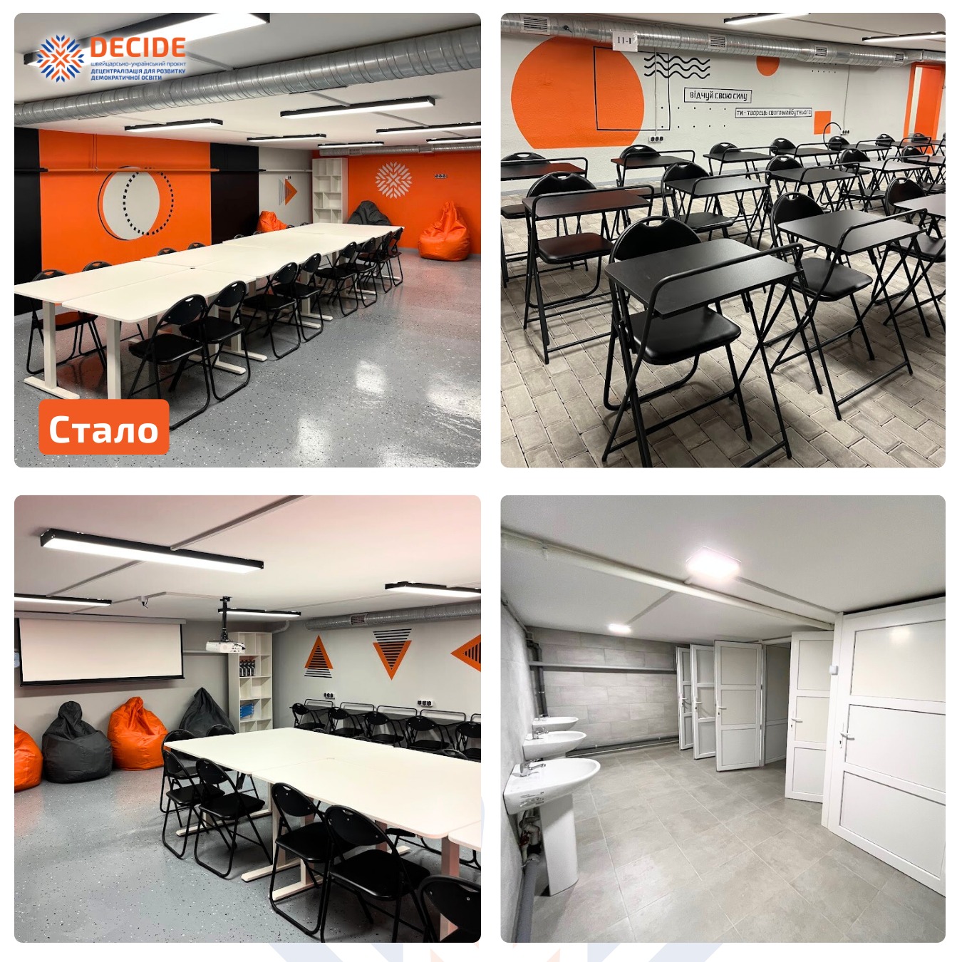 Тут відремонтували понад 370 кв. м простору: провели демонтаж, залили нові підлоги, встановили систему водопостачання та каналізації, провели електрику й встановили вентиляцію. Укриття обладнали ноутбуками, планшетами, мультимедійним проєктором, фліпчартами та сучасними меблями для комфорту учнів.