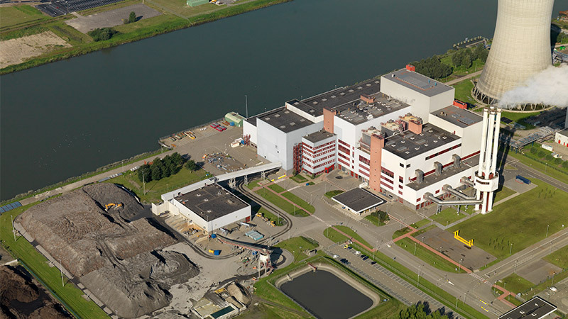 Сміттєспалювальний завод у місті Мурдайк. Ближча до ріки частина його корпусів є сміттєспалювальною піччю, а все решта призначена для фільтрації диму. Завдяки потужним очисним системам, з труб заводу йде звичайний водень