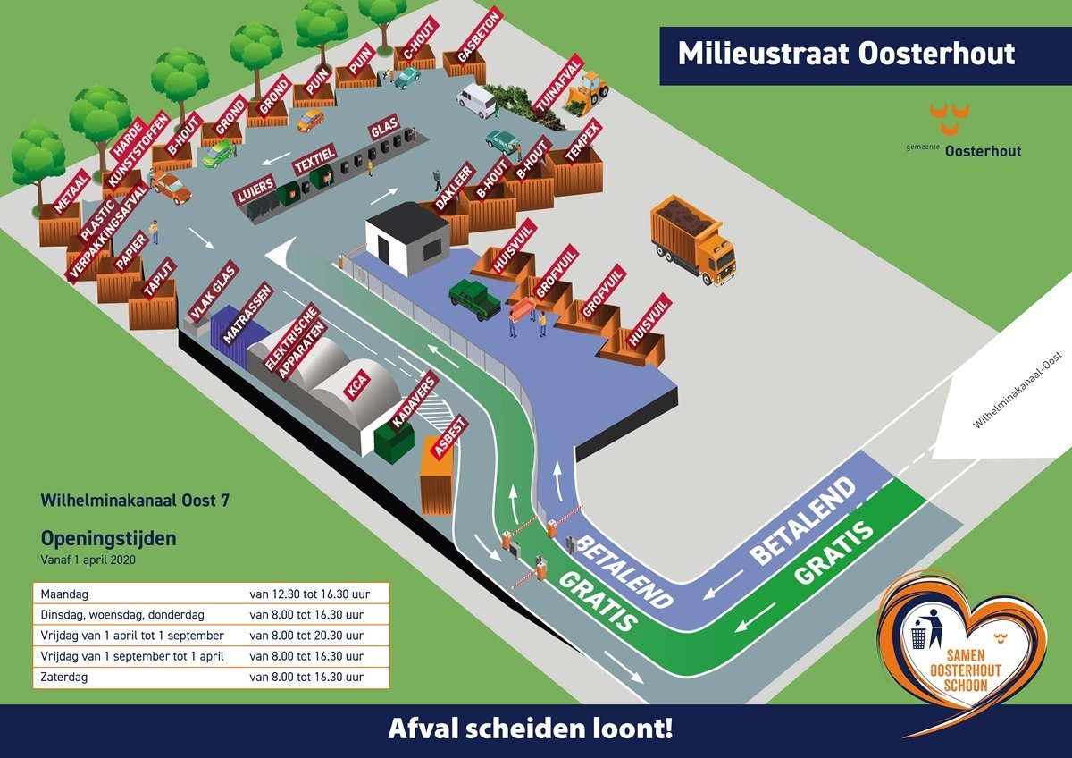 3D-план сортувального центру Мільострат в Остерхауті. Зеленою доріжкою з написом GRATIS (БЕЗОПЛАТНО) заїжджають ті, хто мають відходи, які відповідають 26-м різним контейнерам. У центрі – група контейнерів для підгузків, текстилю та скла різних видів. Ліворуч – контейнери для електротехніки, азбесту, килимів, паперу, пластику, металу тощо. Праворуч – для бетону і садового сміття. Блакитною доріжкою з написом BETALEND (ПЛАТНО) заїжджають ті, хто хочуть здати великогабаритні відходи, які вони не можуть або не хочуть розбирати (наприклад, старі меблі). При цьому прихована під землею вага двічі непомітно зважує кожну машину, а потім оцінює вагу викинутого вантажу і виставляє рахунок, який сплачується карткою на виїзді