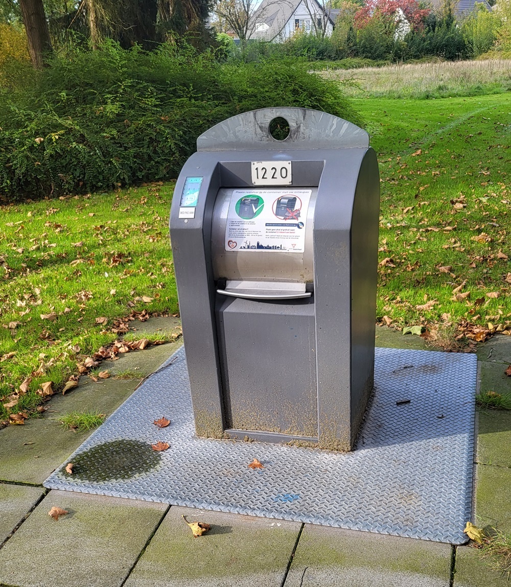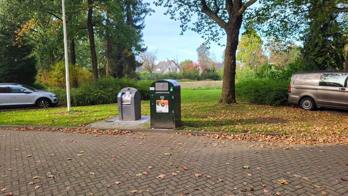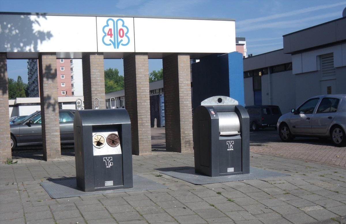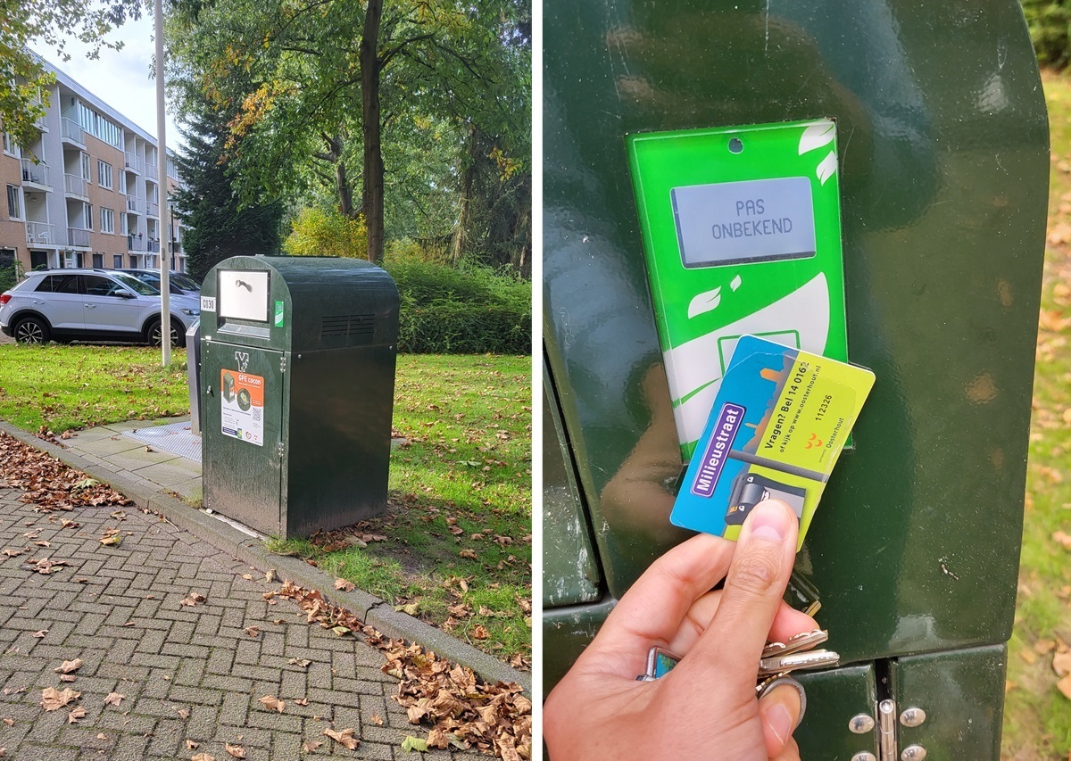 Ліворуч – вихід з підземного контейнера для скла на одній з вулиць Остерхаута. У ньому є окремі відділення для білого і кольорового сміття. Праворуч – вихід з контейнера для «іншого» сміття. Скло приймають безоплатно, а за кожне відкриття контейнера з «іншими» відходами нараховується по 3 євро. Відкривається він за допомогою картки, що її безоплатно отримує від муніципалітету кожне домогосподарство
