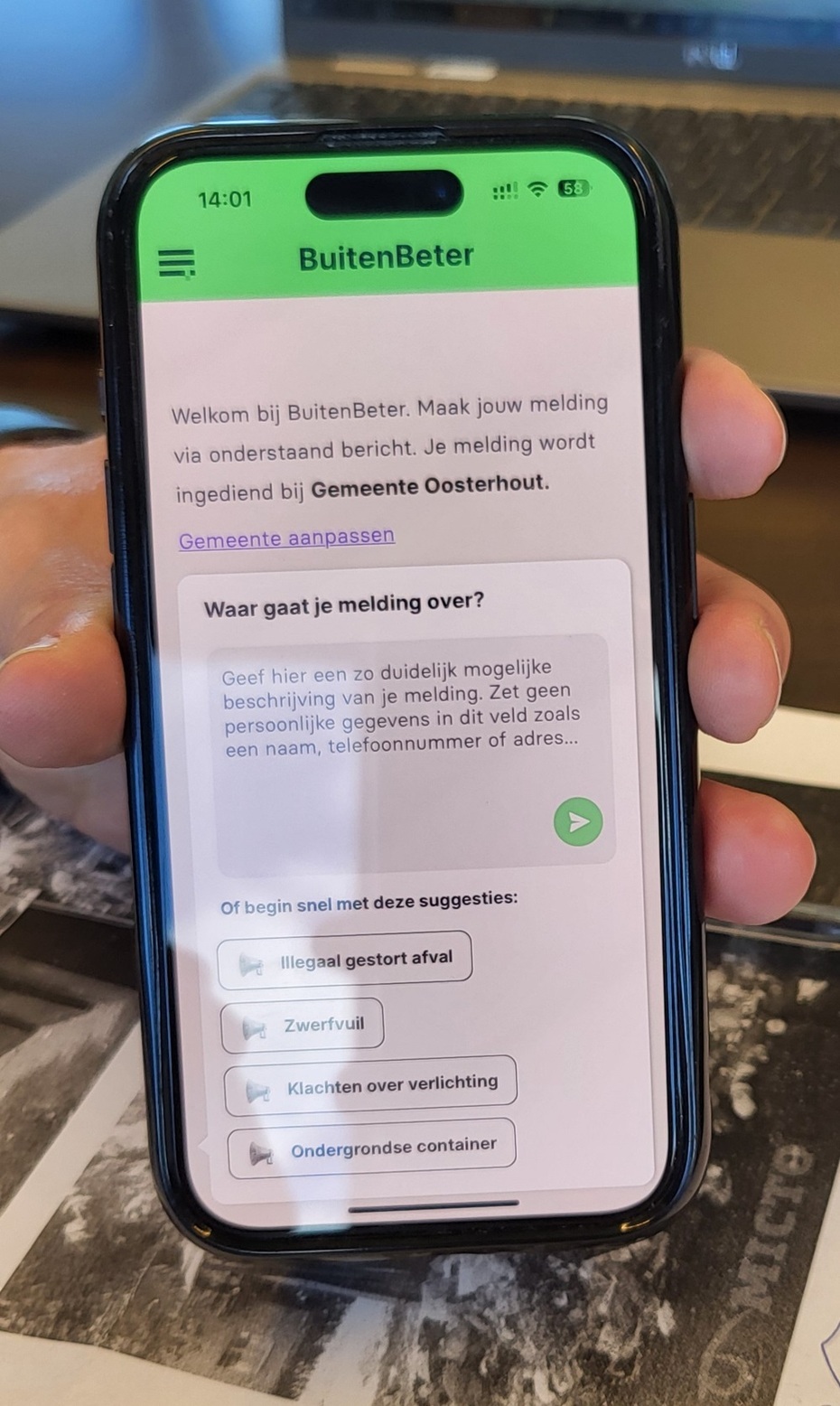 Муніципальний застосунок, у якому пояснюється, як повідомляти муніципалітет про різні справи, які він має виконати для громади