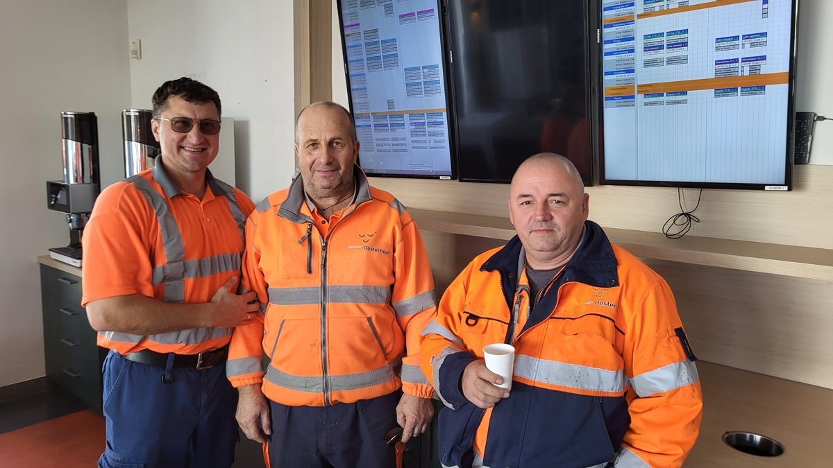 У комунальному підприємстві муніципалітету Остархаут працюють кілька українців, які приїхали сюди через повномасштабне вторгнення росії до України. Зліва направо: Віталій Мельничук, Віталій Грубан, Олександр Дяченко. Віталій Грубан приїхав лише два місяці тому, відслуживши два роки у Збройних Силах України і демобілізувавшись за віком