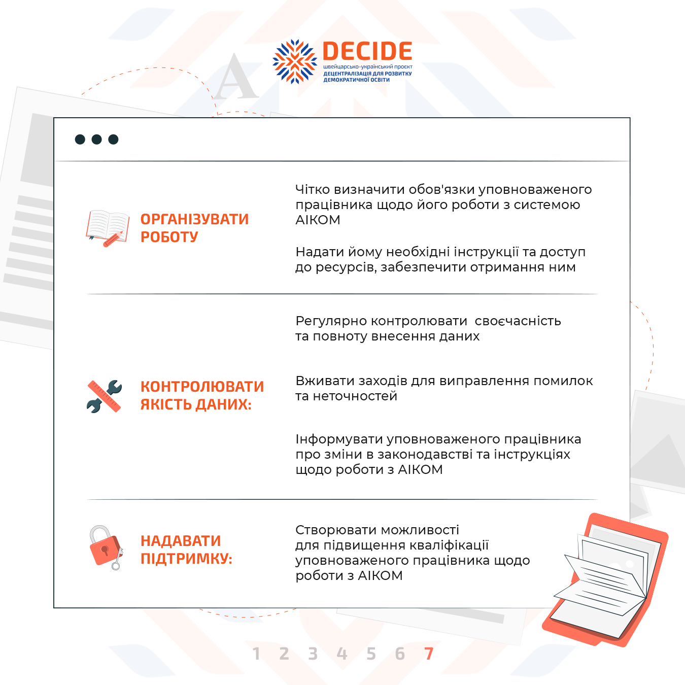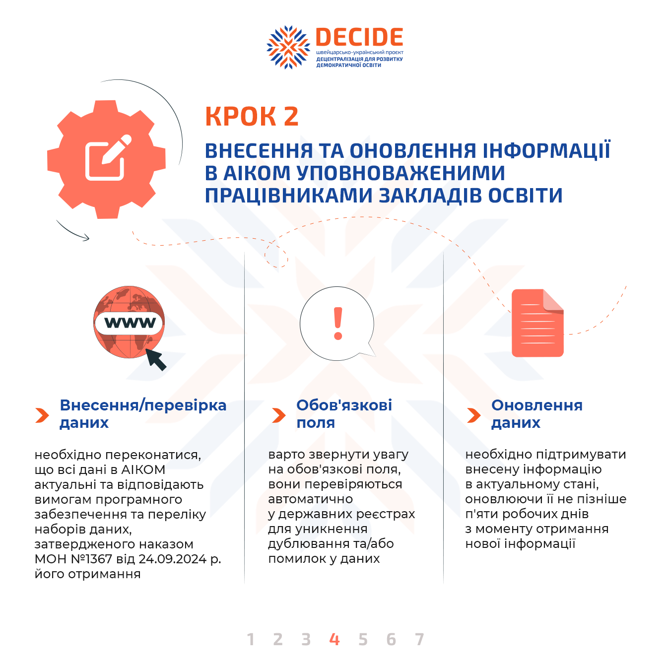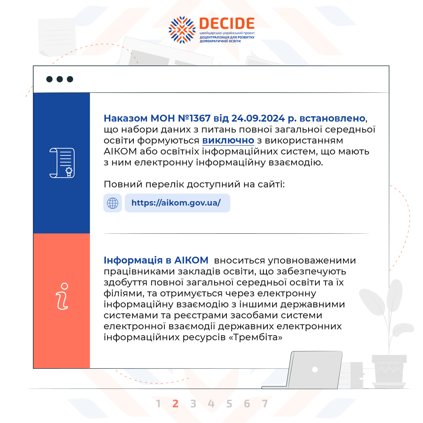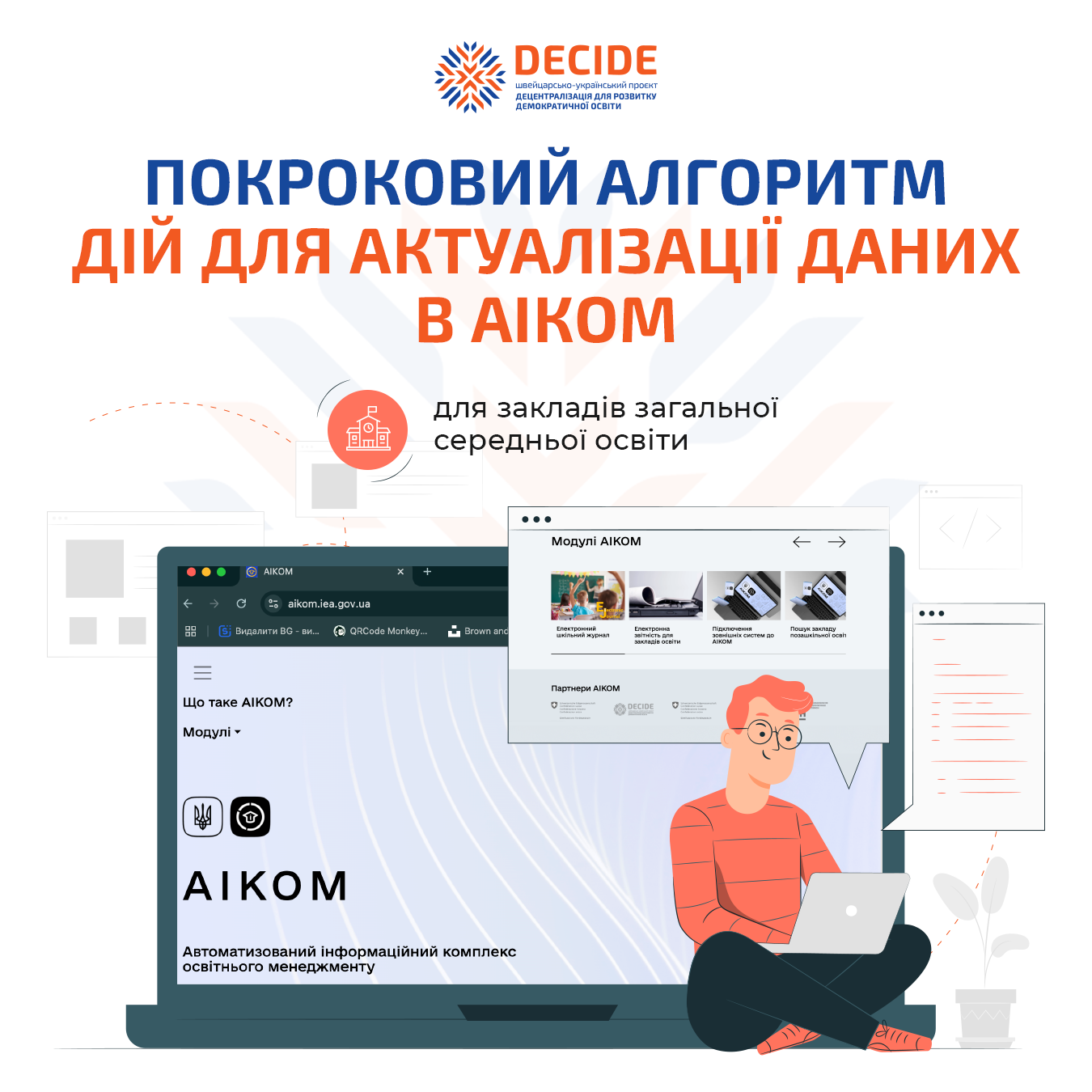 Міністерство освіти і науки України спрощує процес подання звітності для закладів загальної середньої освіти. Відтепер усі необхідні показники і управлінська звітність у сфері загальної середньої освіти будуть розраховуватись і формуватись автоматично через систему АІКОМ (Автоматизований інформаційний комплекс освітнього менеджменту). На думку експертів Швейцарсько-українського проєкту DECIDE, це значно спростить звітування та узагальнення даних, а також дозволить отримати якісну інформацію для ухвалення важливих рішень.