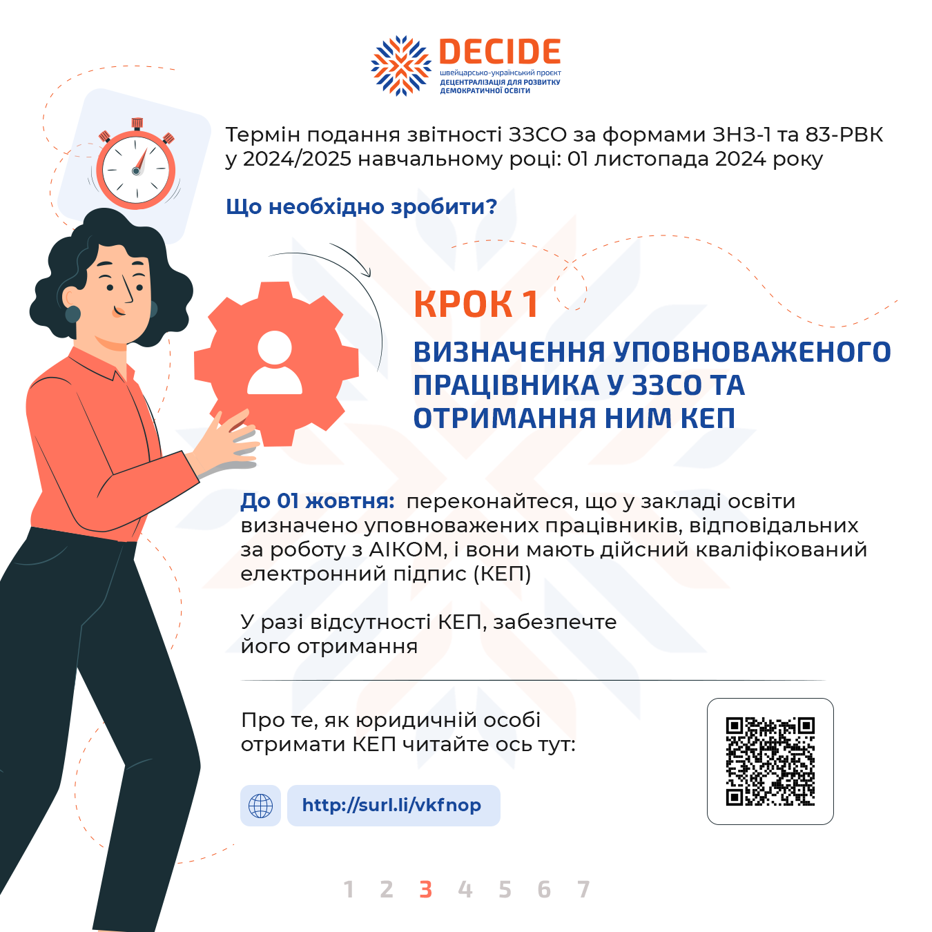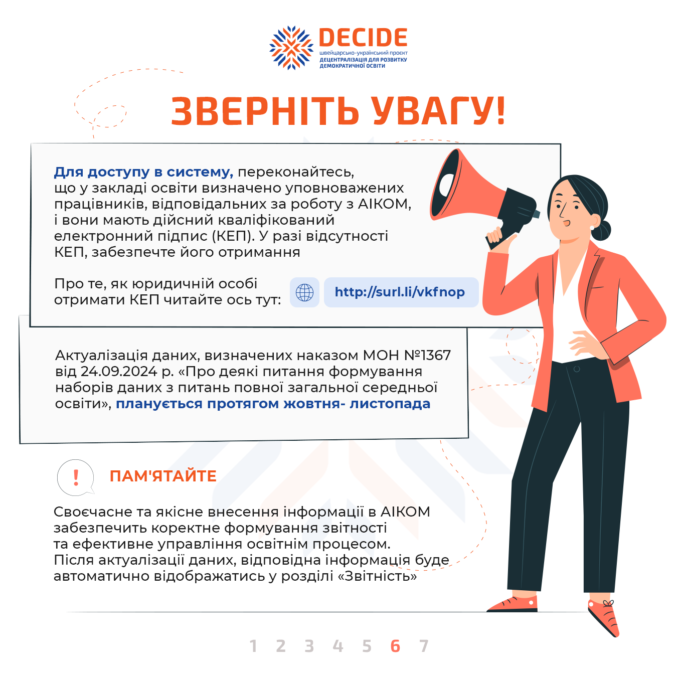 Щоб працювати в системі АІКОМ, керівники закладів освіти мають забезпечити наявність кваліфікованого електронного підпису (КЕП) для всіх відповідальних працівників до 1 жовтня 2024 року. Інструкція, як отримати КЕП, вже доступна за посиланням.