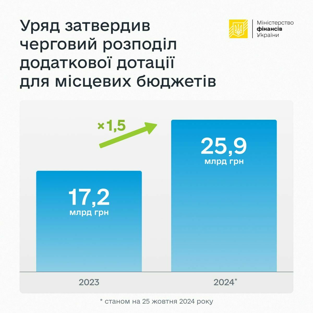 З початку 2024 року Уряд розподілив додаткової дотації місцевим бюджетам на загальну суму 25,9 млрд грн, що в 1,5 рази більше, ніж за весь 2023 рік (17,2 млрд грн).