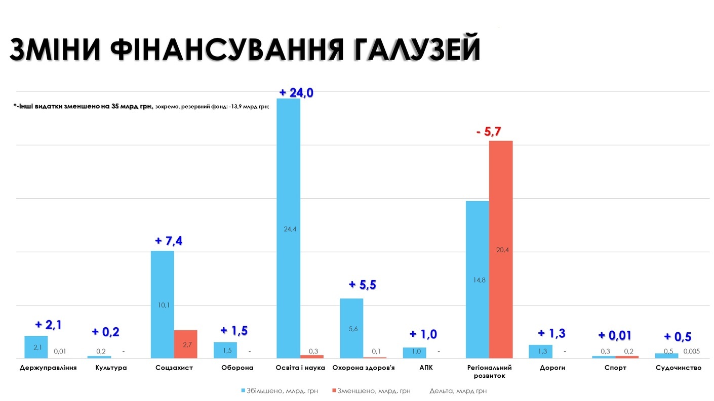 Збільшення також отримали оборонний сектор (+1,5 млрд грн), АПК (+1,0 млрд грн на фінансову підтримку сільгосп. виробників), дороги державного значення (+1,3 млрд грн), спорт (+0,01 млрд грн), і судочинство (+0,5 млрд грн). Додатково передбачено підтримку критичної інфраструктури цивільної авіації – 0,8 млрд грн.