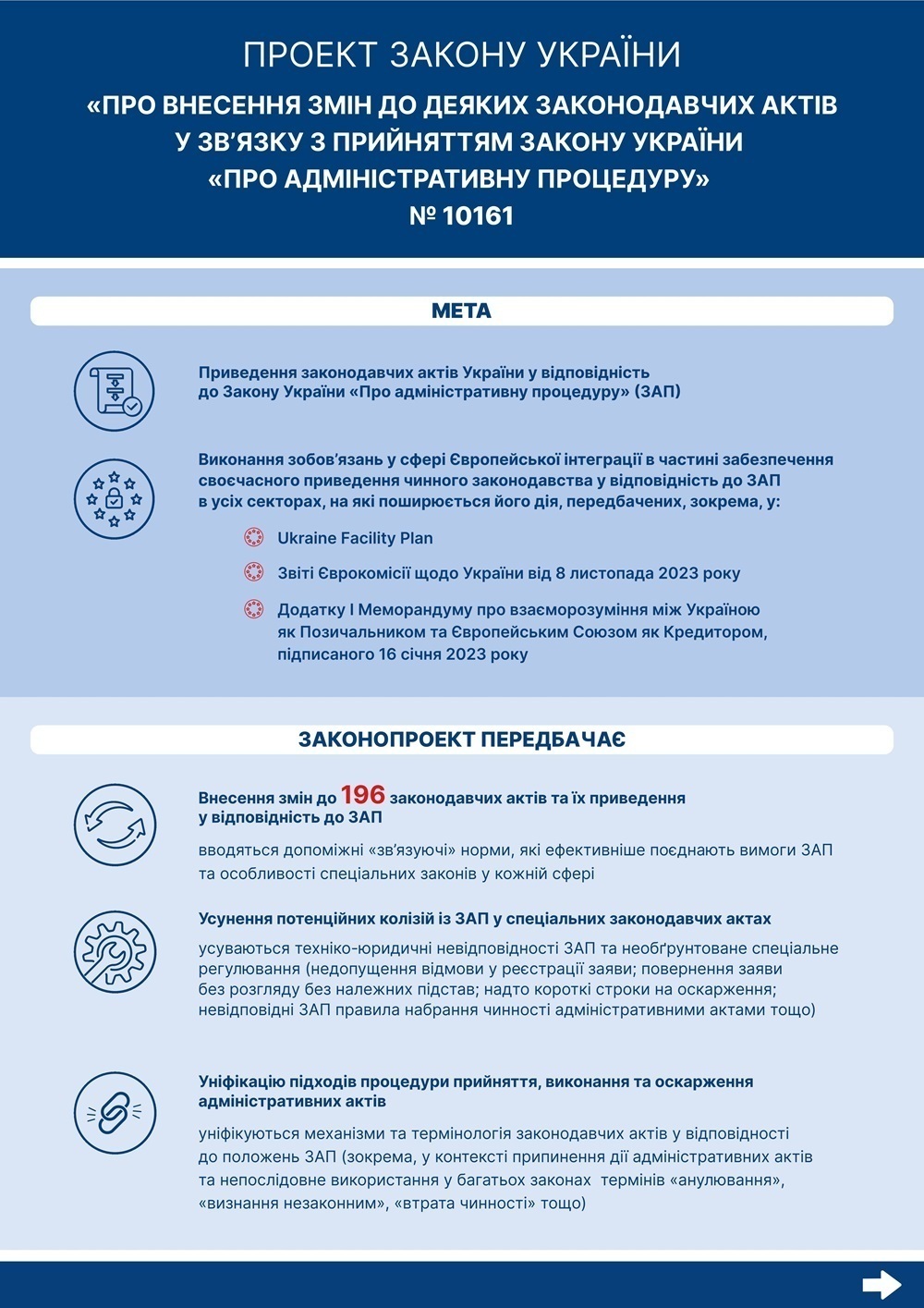 Цей Закон вносить зміни до 196 законодавчих актів та усуває колізії між нормами чинного закону «Про адміністративну процедуру» і спеціальними законодавчими актами, а також наближує законодавство України до стандартів країн Європейського Союзу, де діють уніфіковані правила адміністративних процедур.