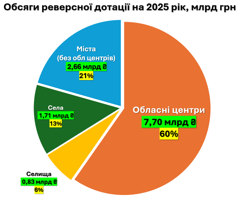 Реверсна дотація розраховується за спеціальною формулою, яка враховує фінансову спроможність територіальних громад. Багато громад потрапили під дію цього механізму проте, якщо говорити мовою цифр, на 2025 рік: 60% реверсу ТГ складає реверс міст-обласних центрів (7,7 млрд грн). Варто зазначити, що в переліку є селищні громади в яких річне вилучення становитиме всього 37,4 тис. грн (або 0,03% бюджету), 116,2 тис грн (або 0,04% бюджету) тощо.