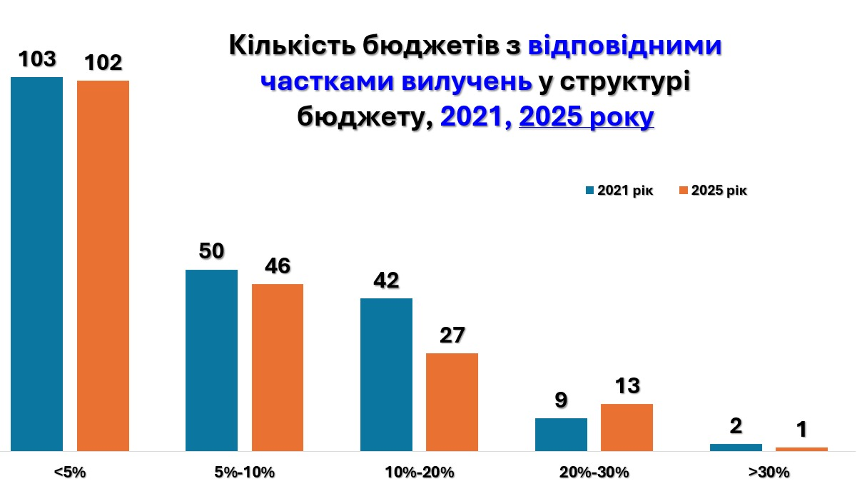 На графіку синім кольором показано кількість бюджетів за частками вилучень у їх структурі за 2021 рік. Найбільша кількість бюджетів (103) припадає на категорію з вилученнями менше 5%. У категорії з вилученнями від 5% до 10% – 50 бюджетів, від 10% до 20% – 42 бюджети. Значно менше бюджетів мають вилучення в межах 20%-30% (9) та понад 30% (2).