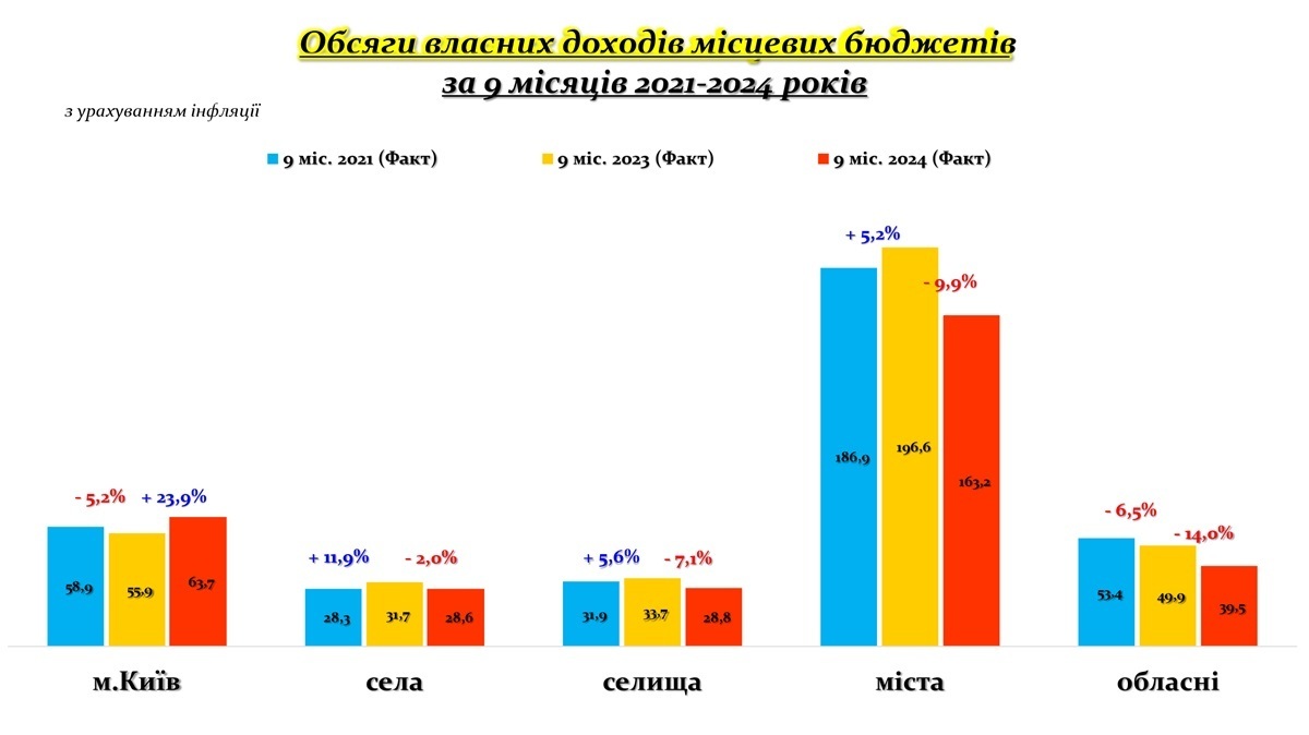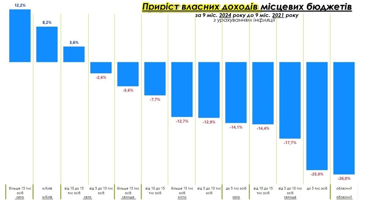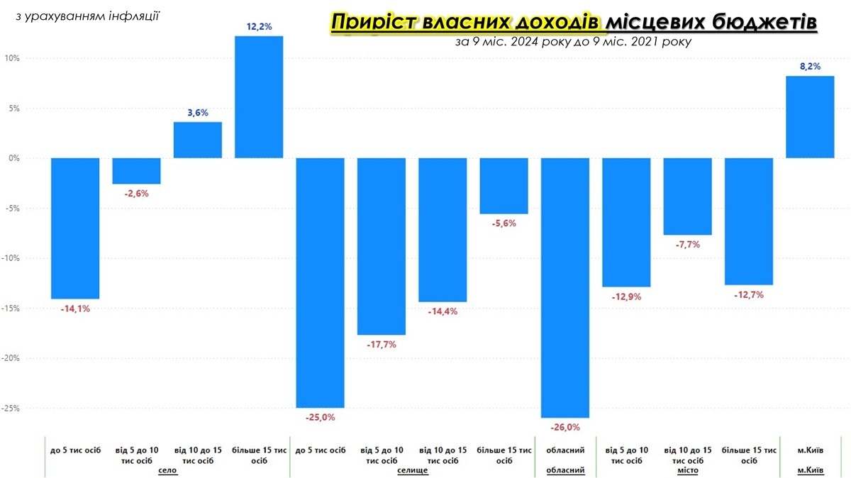 Аналіз приросту власних доходів місцевих бюджетів за дев’ять місяців 2024 року, порівняно з 9 міс. 2021 року з урахуванням інфляції, свідчить про суттєві диспропорції у фінансуванні громад.