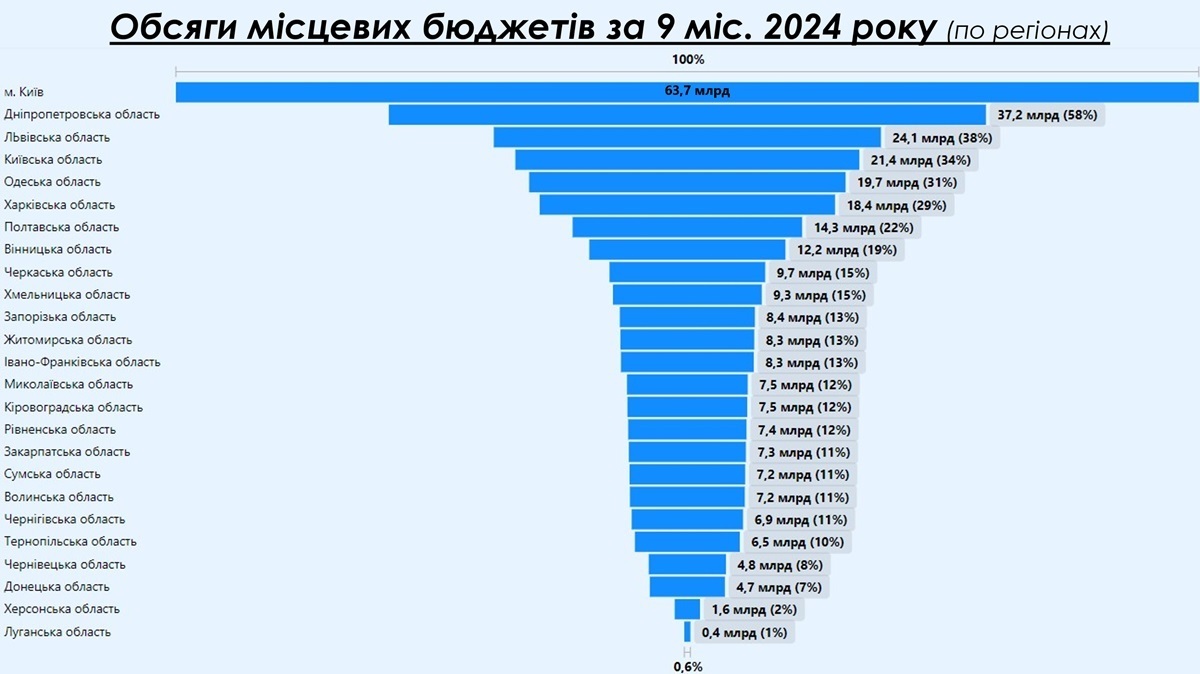 Аналіз обсягів місцевих бюджетів за дев’ять місяців 2024 року по регіонах показує суттєву нерівномірність у фінансовій спроможності. Київ залишається беззаперечним лідером з бюджетом 63,7 млрд грн, що становить 100% у відносному масштабі. Це пов’язано з концентрацією бізнесу, адміністративних установ та порівняно високою економічною активністю столиці навіть в умовах війни. Окрім того, зважаючи на проблематику несправедливого зарахування ПДФО, великі компанії із значною кількістю відокремлених підрозділів сплачують податки за місцем розташування головного офісу. Зазначене відображає необхідність більш рівномірного розподілу основного бюджетонаповнюючого податку (ПДФО), згідно з рекомендаціями ЄС, за місцем проживання мешканців.