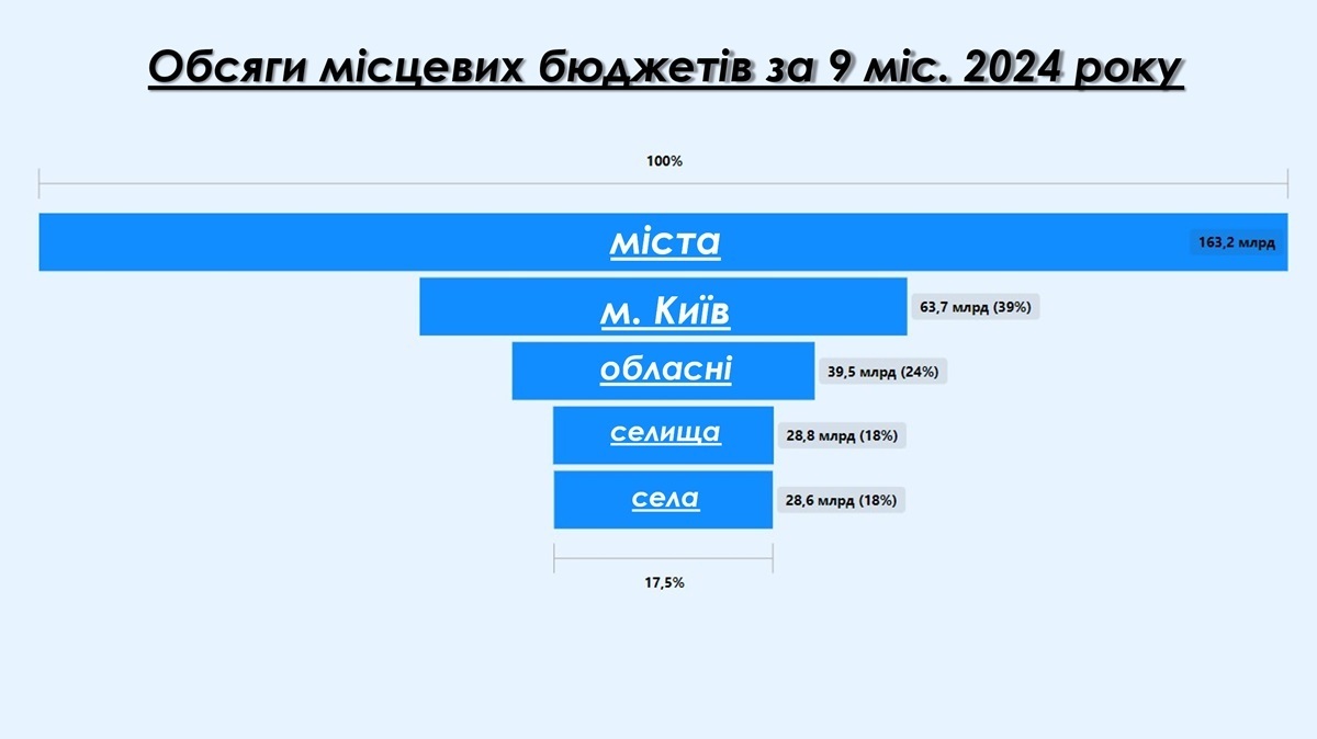 Селища та села забезпечили по 18% доходів кожне (28,8 млрд грн та 28,6 млрд грн відповідно). Це свідчить про відносно однаковий рівень фінансового наповнення в таких громадах, проте їхні бюджети залишаються обмеженими для реалізації масштабних інфраструктурних або соціальних проектів.