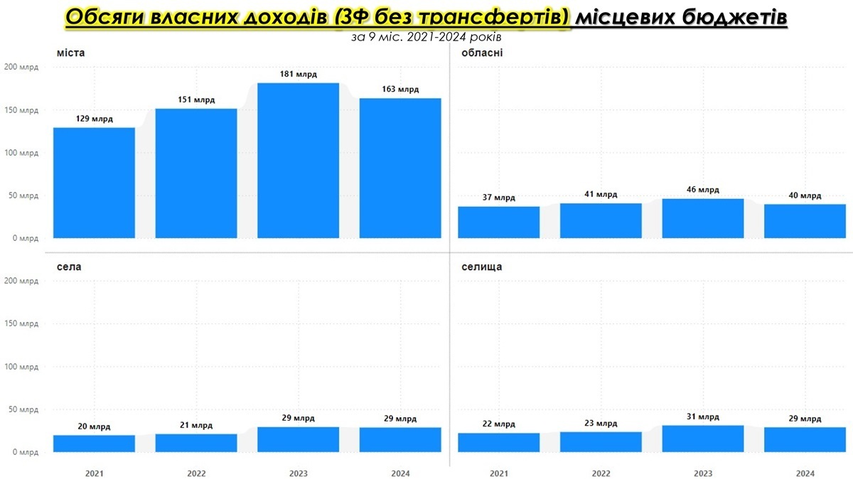 Міста показали помітне зростання доходів з 129 млрд грн у 2021 році до 181 млрд грн у 2023 році. Проте у 2024 році відбулося зниження до 163 млрд грн, що зумовлено вилученням військового ПДФО. Враховуючи інфляційний фактор, реальне фінансове забезпечення міських бюджетів суттєво знизилось, навіть попри зростання абсолютних доходів у попередні роки.