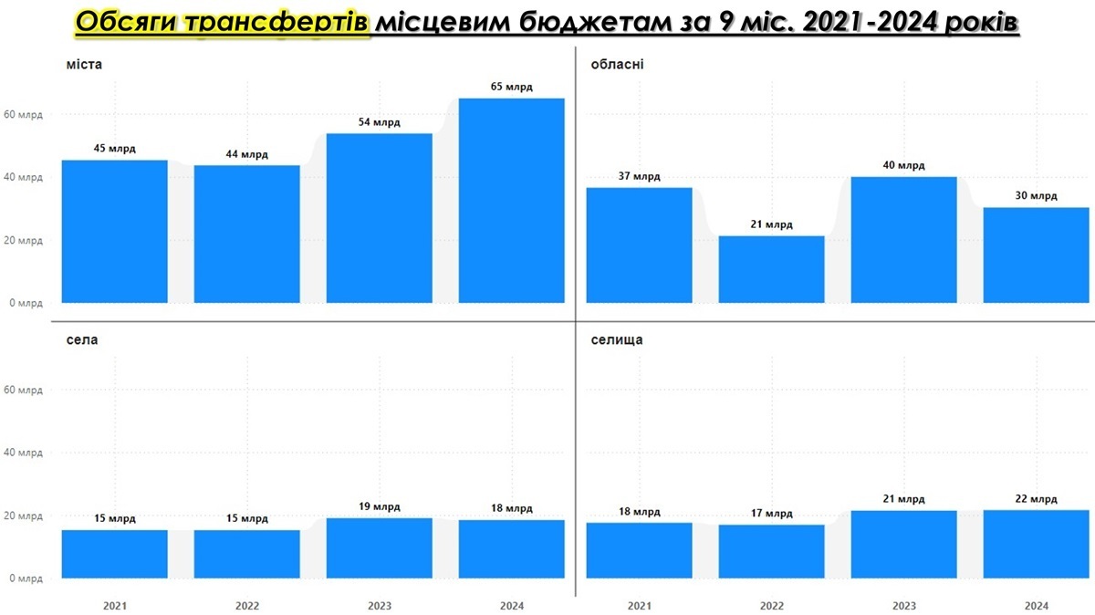 Міста отримували стабільний обсяг трансфертів у 2021-2022 роках (45 млрд грн та 44 млрд грн відповідно), проте у 2023 році цей показник зріс до 54 млрд грн, досягнувши піку у 2024 році — 65 млрд грн. Це свідчить про зростання потреб міст у фінансовій підтримці через скорочення власних доходів і зростання витрат, пов'язаних із необхідністю додаткових коштів на відбудову та відновлення зруйнованої інфраструктури внаслідок російських ганебних обстрілів, а також необхідністю забезпечити належну життєдіяльність населення в нинішніх умовах війни.