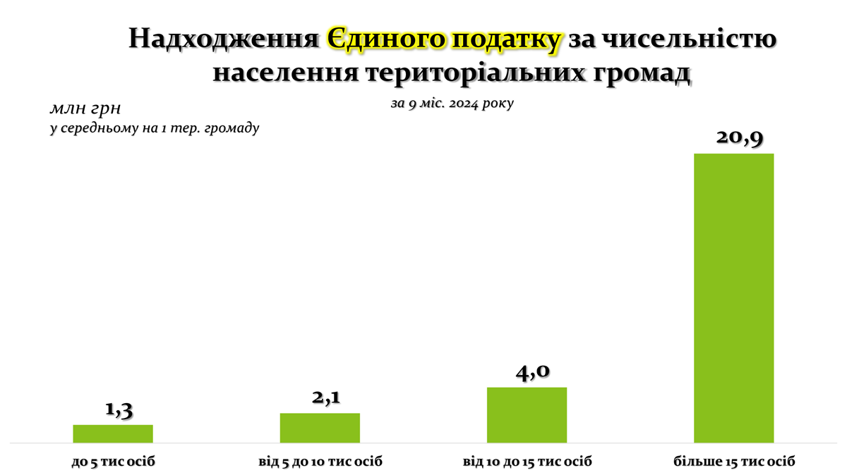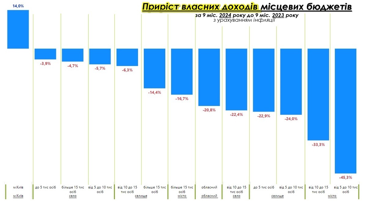 Міста показали різну динаміку: у містах з населенням понад 15 тис. осіб доходи скоротилися на 12,7%, тоді як у категоріях менших міст спад доходів коливався від 7,7% до 12,9%. Попри менший спад порівняно із селищами, ці цифри свідчать про загальний негативний тренд.