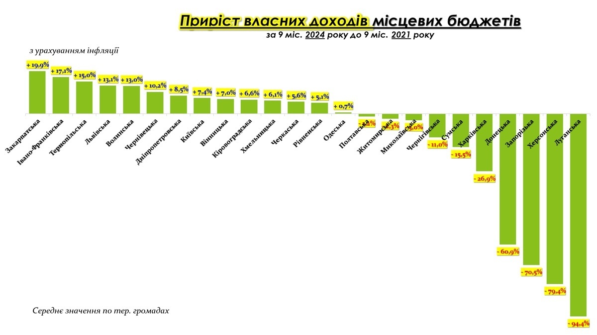 Аналіз приросту власних доходів місцевих бюджетів за дев’ять місяців 2024 року, порівняно з 2021 роком із урахуванням інфляції, демонструє суттєві регіональні розбіжності, що відображають як економічну активність, так і вплив війни на фінансову спроможність громад.