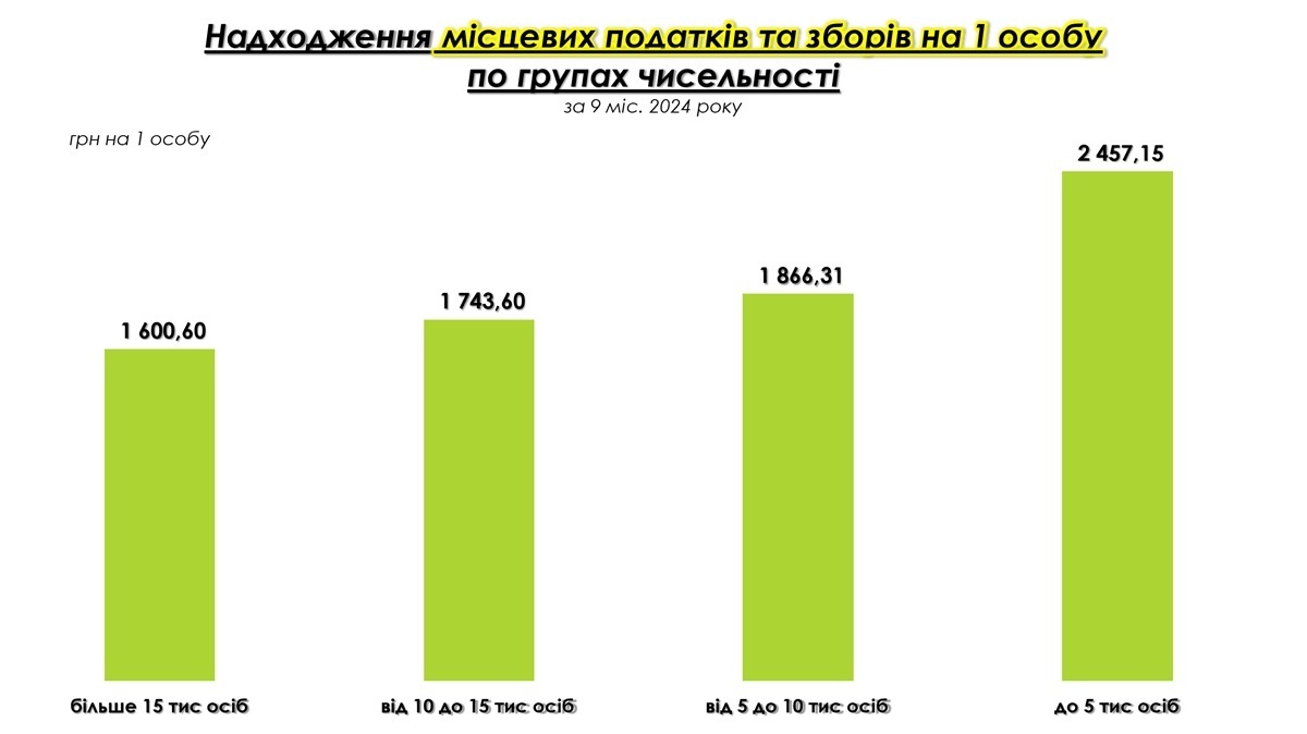 Міста мають нижчі надходження на одну особу, порівняно з селами та селищами. У 2021 році цей показник становив 1 692,8 грн, а у 2024 році — 1 580 грн. Незважаючи на загальну стабільність, міста стикаються з розосередженням податкової бази через більшу кількість населення та специфіку економічної активності.