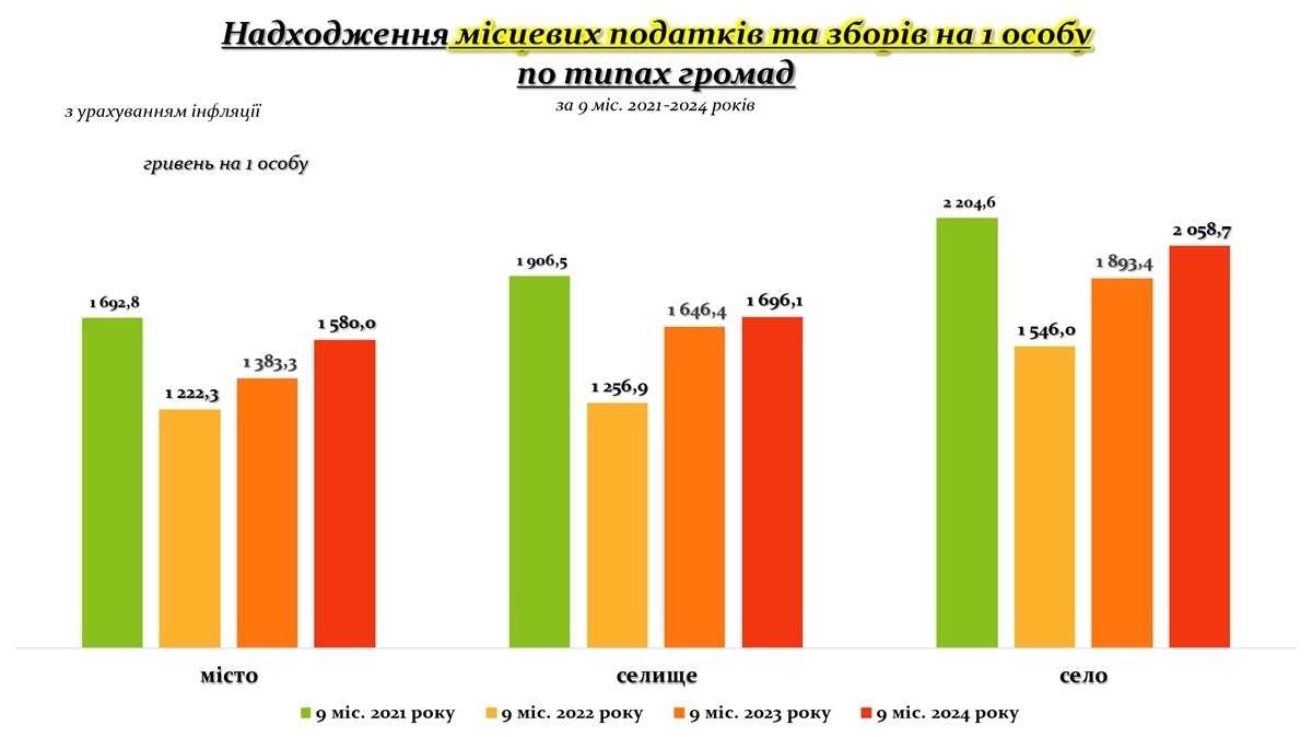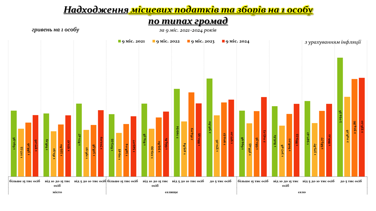 Аналіз надходжень місцевих податків та зборів на одну особу за типами громад за дев’ять місяців 2021–2024 років із урахуванням інфляції демонструє різну динаміку в містах, селищах та селах.