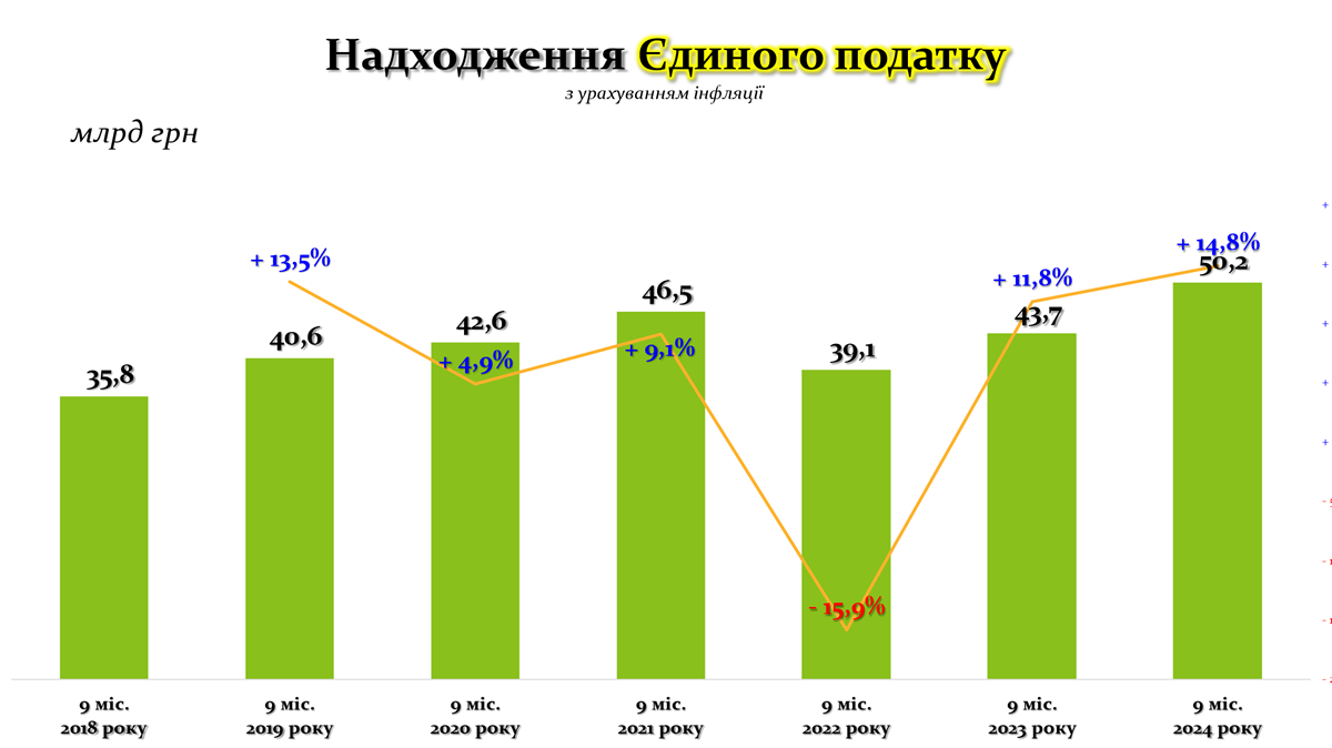 Надходження єдиного податку за дев’ять місяців 2018–2024 років з урахуванням інфляції демонструють як періоди стабільного зростання, так і значні втрати, зумовлені впливом зовнішніх факторів.
