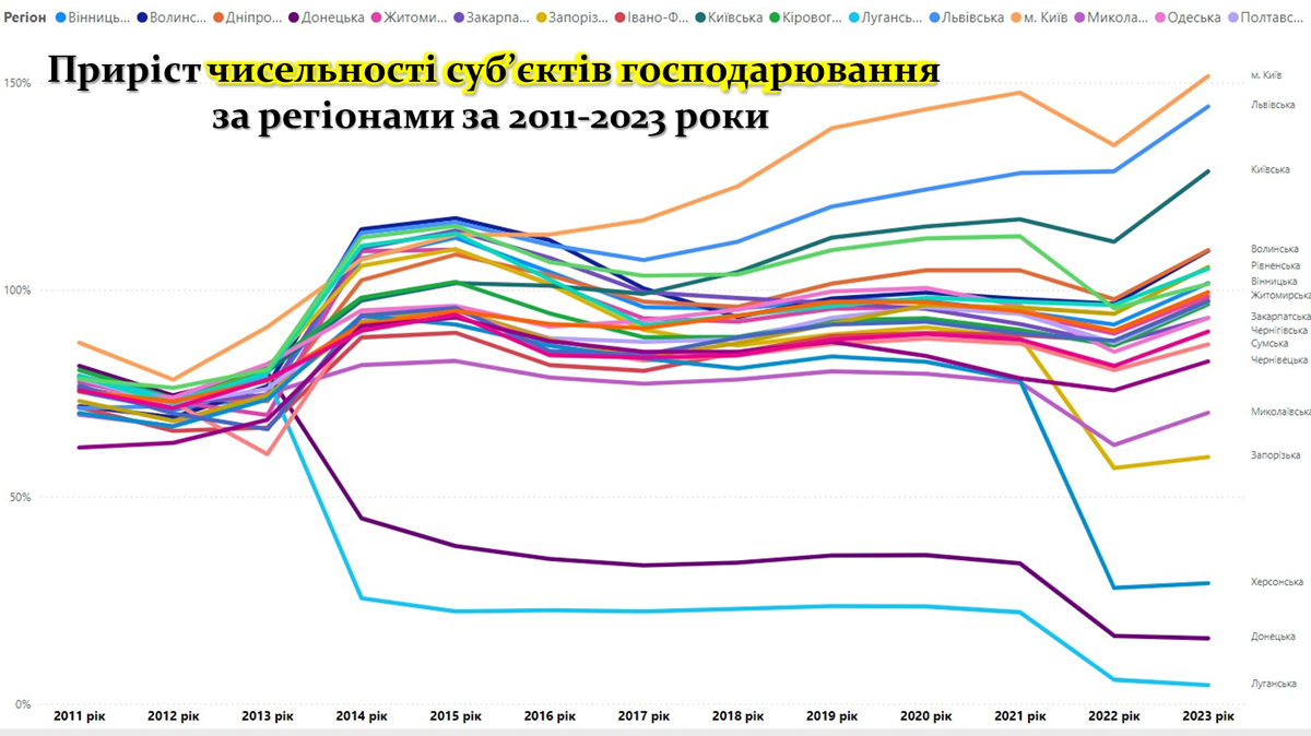 У тилових регіонах, таких як Львівська, Закарпатська та Київська області, а також у місті Києві, спостерігається стабільне зростання чисельності суб’єктів господарювання. Це можна пояснити активною релокацією бізнесу із зон бойових дій, розвитком логістичної та економічної інфраструктури, а також більш сприятливими умовами для ведення бізнесу. Наприклад, Львівщина та Закарпаття виграють завдяки своїй близькості до європейських ринків.