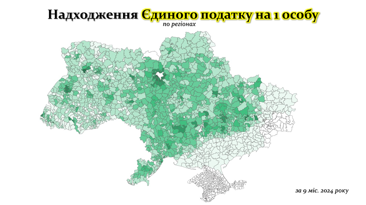 Карта надходжень Єдиного податку на 1 особу в розрізі територіальних громад демонструє значну регіональну варіативність у спроможності громад акумулювати податкові надходження від ФОПів. Найвищі показники спостерігаються у центральних, західних та окремих північних регіонах країни, де економічна активність є стабільною завдяки розвитку малого бізнесу. Львівська, Закарпатська та Тернопільська області виділяються середньостатистичними показниками завдяки місцевому підприємництву та економічній адаптації в умовах війни. Київ та громади Київської області також демонструють високі надходження завдяки концентрації бізнесу, розвитку інфраструктури та високому рівню економічної активності. Центральні регіони показують високі результати.
