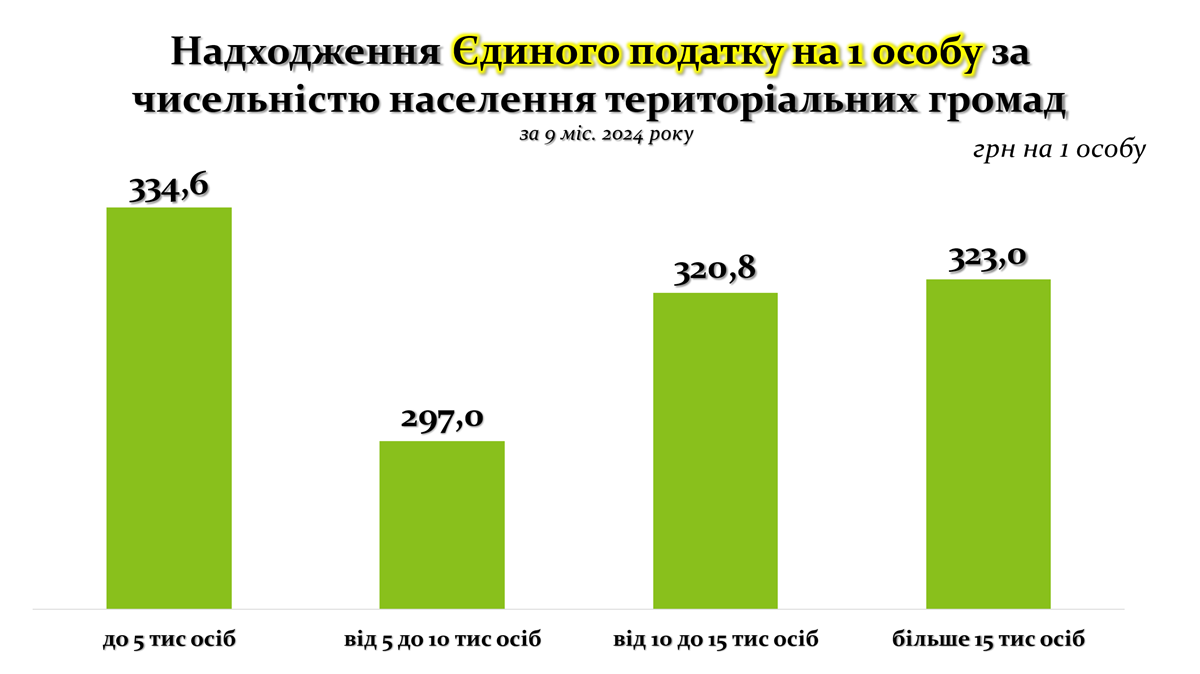 У селах середнє надходження становить 333,3 грн на одну особу, що дещо перевищує показники для міст (312,3 грн) і селищ (296,4 грн). Вищі показники у селах можуть бути обумовлені меншою чисельністю населення, через що надходження податків розподіляються на меншу кількість осіб. Міста і селища мають схожі показники, що свідчить про відносну стабільність економічної активності в цих громадах.