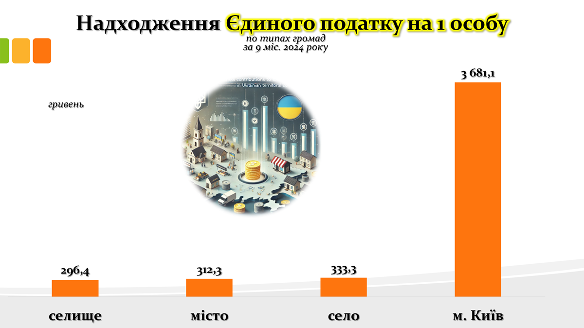 Графік підкреслює суттєві відмінності між селищами, містами, селами та Києвом. Найвищий показник спостерігається у столиці — 3 681,1 грн на одну особу, що значно перевищує середні показники по інших типах громад. Це пояснюється концентрацією бізнес-активності, високою кількістю суб’єктів господарювання та значним економічним потенціалом Києва.