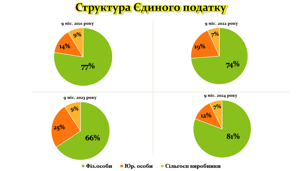У 2021 році основну частку надходжень (77%) формували фізичні особи, що є традиційним для єдиного податку. Юридичні особи забезпечили 14%, а сільськогосподарські виробники — 9%. Ця структура залишалася відносно стабільною до 2022 року, коли частка фізичних осіб знизилася до 74%, а частка юридичних осіб зросла до 19%. Це пояснюється податковими змінами щодо надання можливості великим компаніям переходити на спрощену систему оподаткування. Але пізніше ці новації були скасовані, що знайшло своє відображення у структурі 2024 року.