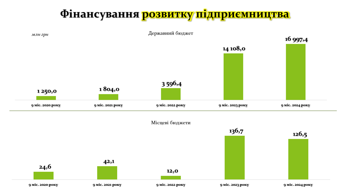 У державному бюджеті фінансування підприємництва зросло з 1 250,0 млн грн у 2020 році до 16 997,4 млн грн у 2024 році. Основний приріст спостерігається після 2022 року, коли показник зріс з 3 596,4 млн грн до 14 108,0 млн грн у 2023 році. Це пояснюється необхідністю відновлення бізнесу в умовах війни, а також активними програмами підтримки малого та середнього підприємництва з боку держави. Така динаміка вказує на централізований підхід до стимулювання економіки через розвиток підприємництва.