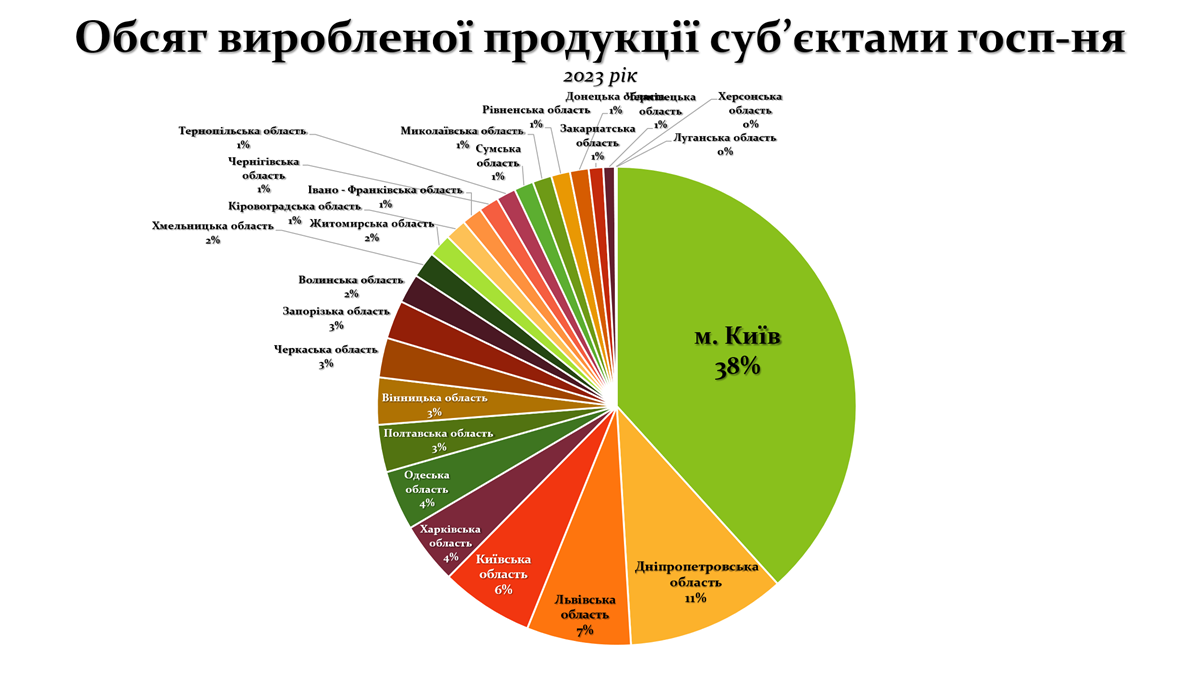 Місто Київ є безперечним лідером із часткою 38% від загального обсягу виробленої продукції. Це пояснюється високою концентрацією бізнесу, розвиненою інфраструктурою, наявністю кваліфікованої робочої сили та значним впливом столичних компаній на національну економіку. Дніпропетровська область займає друге місце з часткою 11%, що свідчить про вагомий внесок промислових підприємств та гірничо-металургійного комплексу. Львівська та Київська області з частками 7% і 6% відповідно демонструють високий рівень економічної активності, обумовлений розвитком промисловості, логістики та сільського господарства.
