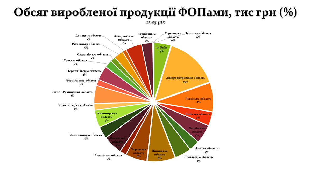 Загалом графік демонструє, що роль ФОПів у регіональній економіці є більш помітною у Дніпропетровській, Львівській, Вінницькій та низці інших областей, тоді як Київ, традиційно домінуючий у загальній економіці, не має такої ж переваги серед малих підприємців. Ці дані підкреслюють важливість підтримки малого бізнесу в регіонах як ключового фактору для стабілізації та відновлення місцевих економік, особливо в умовах війни.