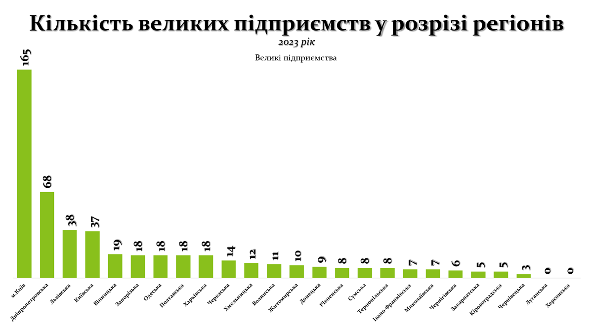 Кількість великих підприємств у розрізі регіонів за 2023 рік вказує на значну концентрацію таких суб’єктів у столиці та кількох промислово розвинених областях.
