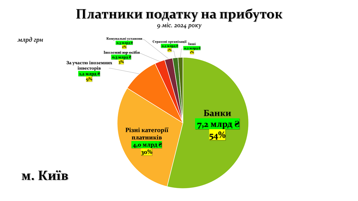 Графік ілюструє структуру податкових надходжень від податку на прибуток за 9 місяців 2024 року в місті Києві. Значна частина цих надходжень, а саме 7,2 млрд грн, що складає 54%, припадає на банки.