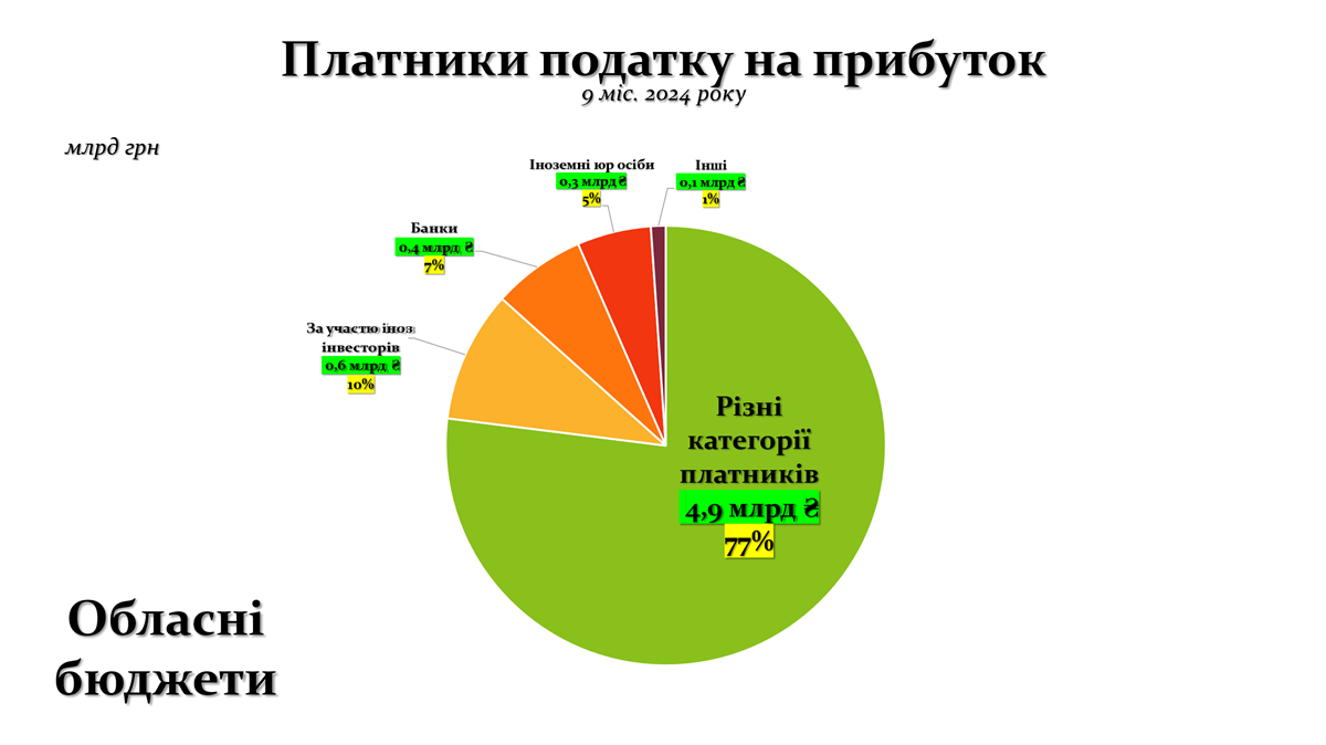 Графік вище демонструє структуру податкових надходжень від податку на прибуток в обласні бюджети за 9 місяців 2024 року. Основна частина надходжень — 4,9 млрд грн або 77% — забезпечена різними категоріями платників, що вказує на диверсифікацію джерел доходів цих бюджетів. До цієї групи входять підприємства з різних галузей, які функціонують на території областей.