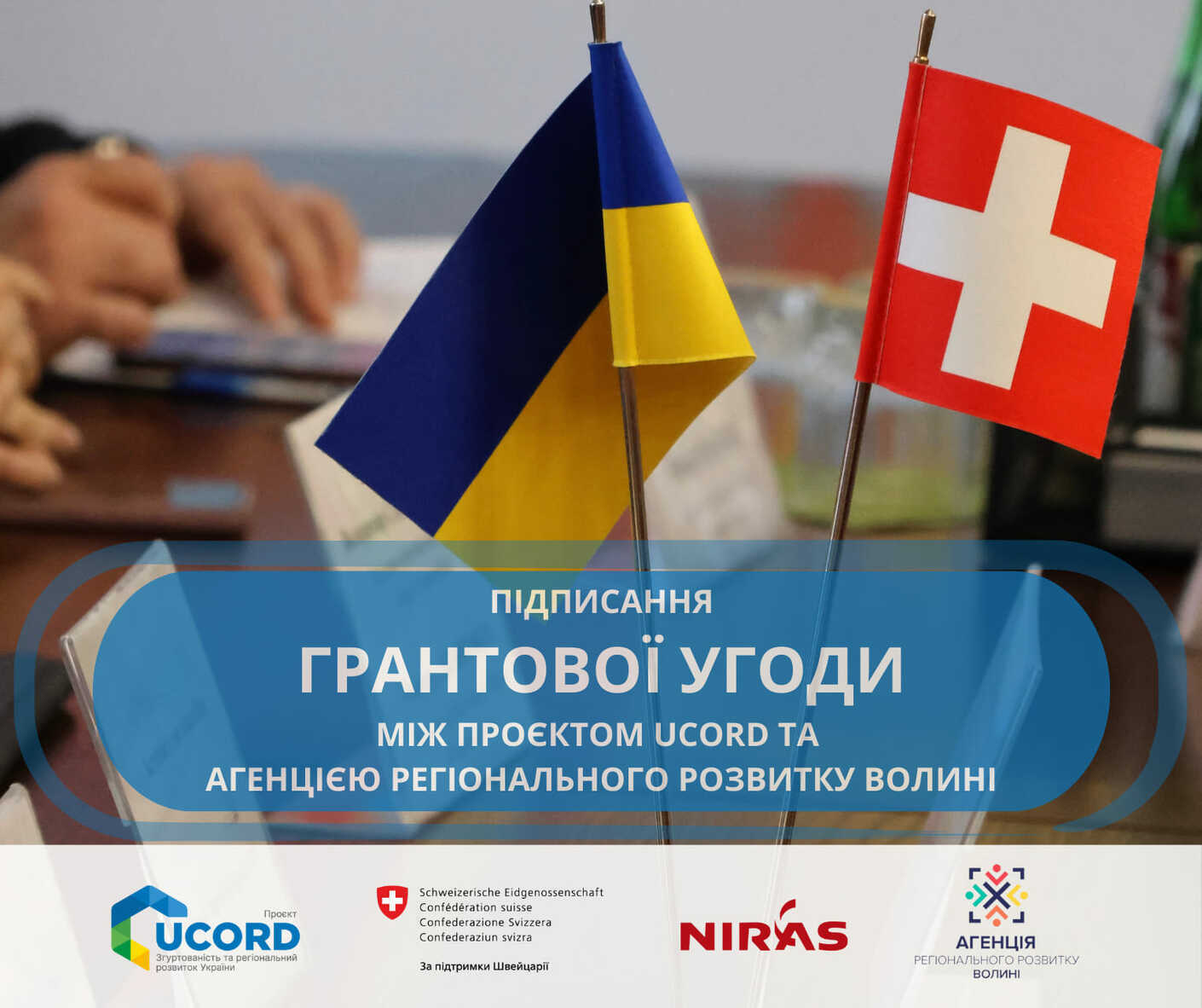 11 грудня Агенція регіонального розвитку Волинської області підписала грантову угоду зі Швейцарсько-українським проєктом «Згуртованість та регіональний розвиток України», UCORD, який втілюється за підтримки Швейцарії через Швейцарську агенцію з розвитку та співробітництва Swiss Development & Cooperation компанією NIRAS Sweden AB.