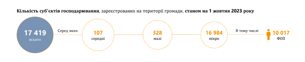 Наприклад, у Броварській міській територіальній громаді, населення якої складає приблизно 120,0 тис осіб, функціонує понад 17.4 тис суб’єктів господарювання[1].