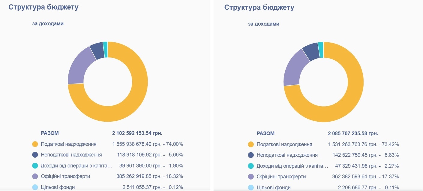 Мал. 1. Показники надходжень до бюджету Броварської міської територіальної громади Київської області за 2023 рік (зліва) та за січень-жовтень 2024 року (справа)[2].