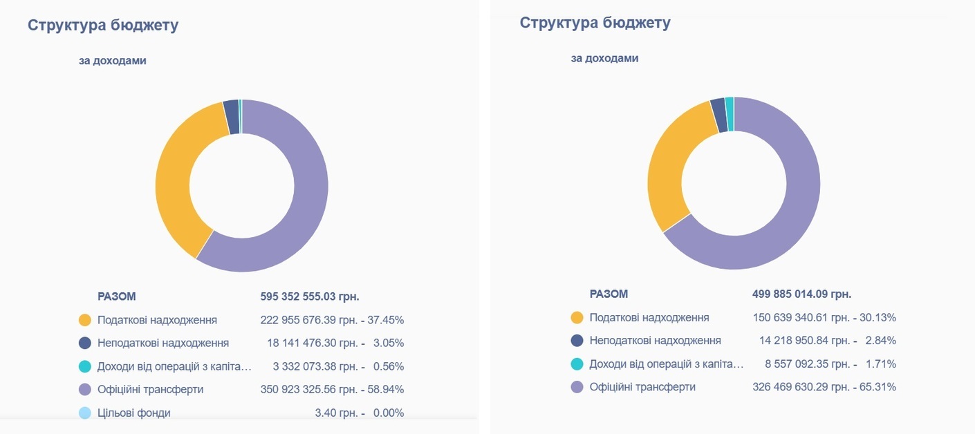 Мал. 1. Показники надходжень до бюджету Камінь-Каширської міської територіальної громади Волинської області за 2023 рік (зліва) та за січень-жовтень 2024 року (справа)[4]