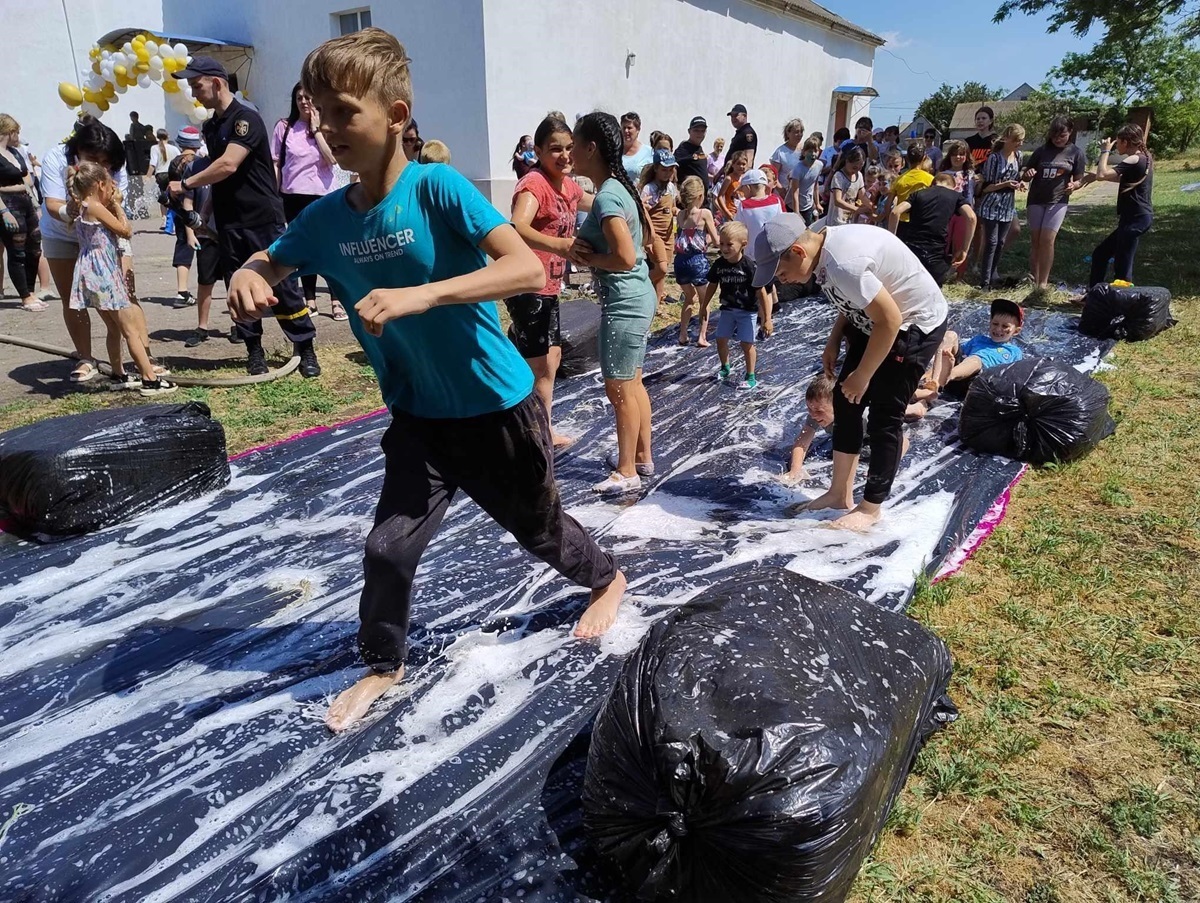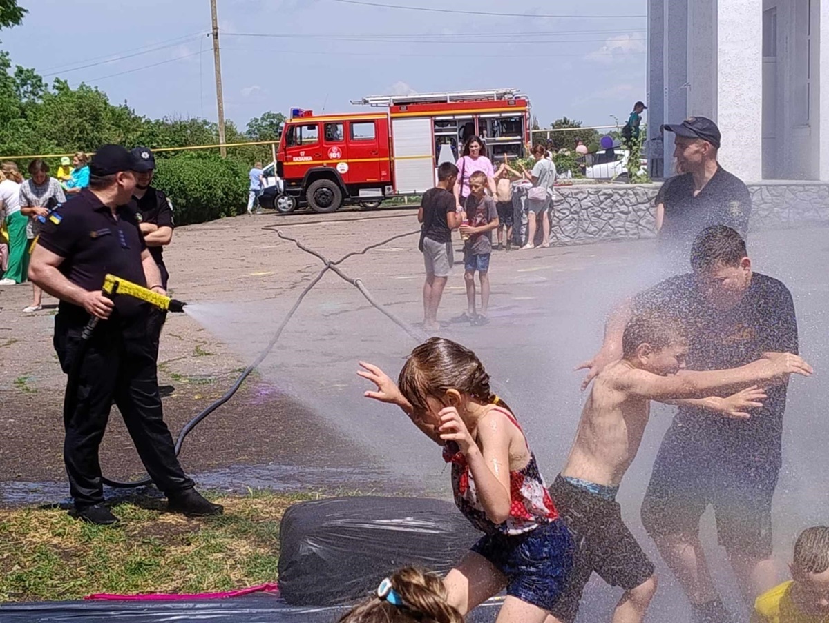 Представники ДСНС Казанківщини створили смуги перешкод, які діти мали подолати. Також демонстрували пожежну машину та спорядження, медичне обладнання для надання першої допомоги, розповідали про мінну безпеку. Особливими атракціонами стало обливання водою та катання на намиленій плівці.