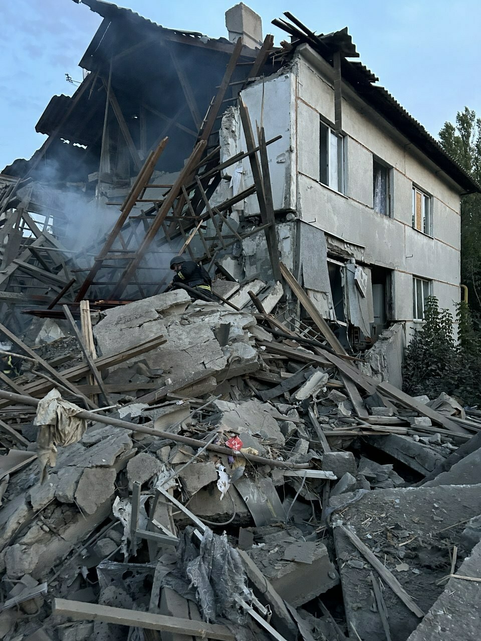Будинок на 16 квартир після прямого попадання російської ракети у селищі Борова