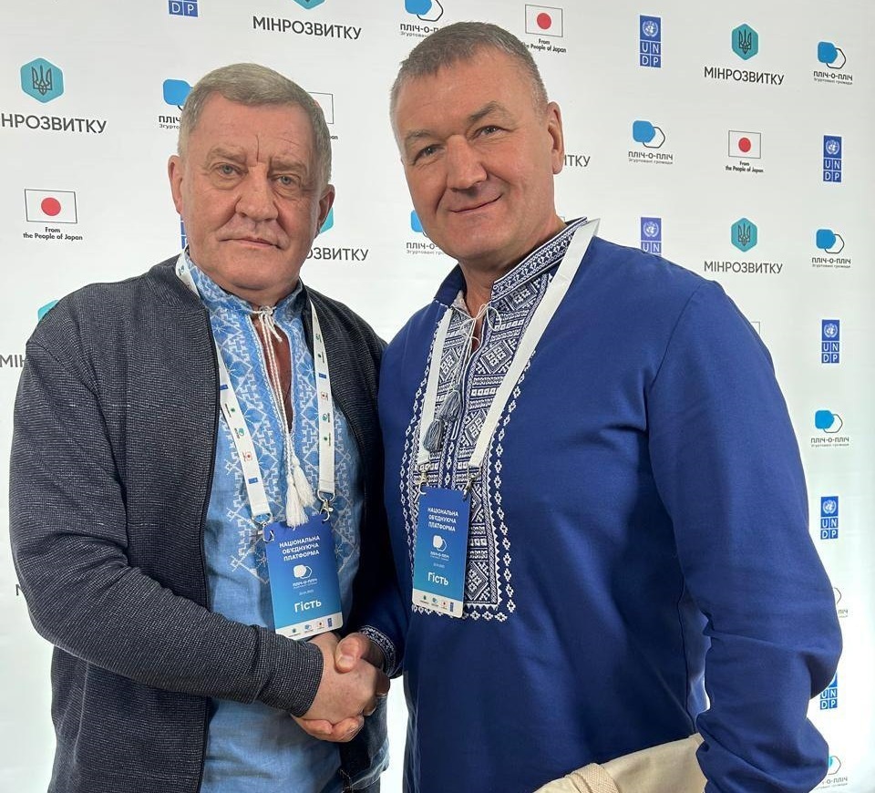 Начальник Борівської селищної військової адміністрації Олександр Тертишний (ліворуч) та голова Жашківської міської територіальної громади Черкаської області Ігор Цибровський невдовзі після знайомства на презентації проєкту «Пліч-о-пліч: згуртовані громади» у Києві 22 січня цього року