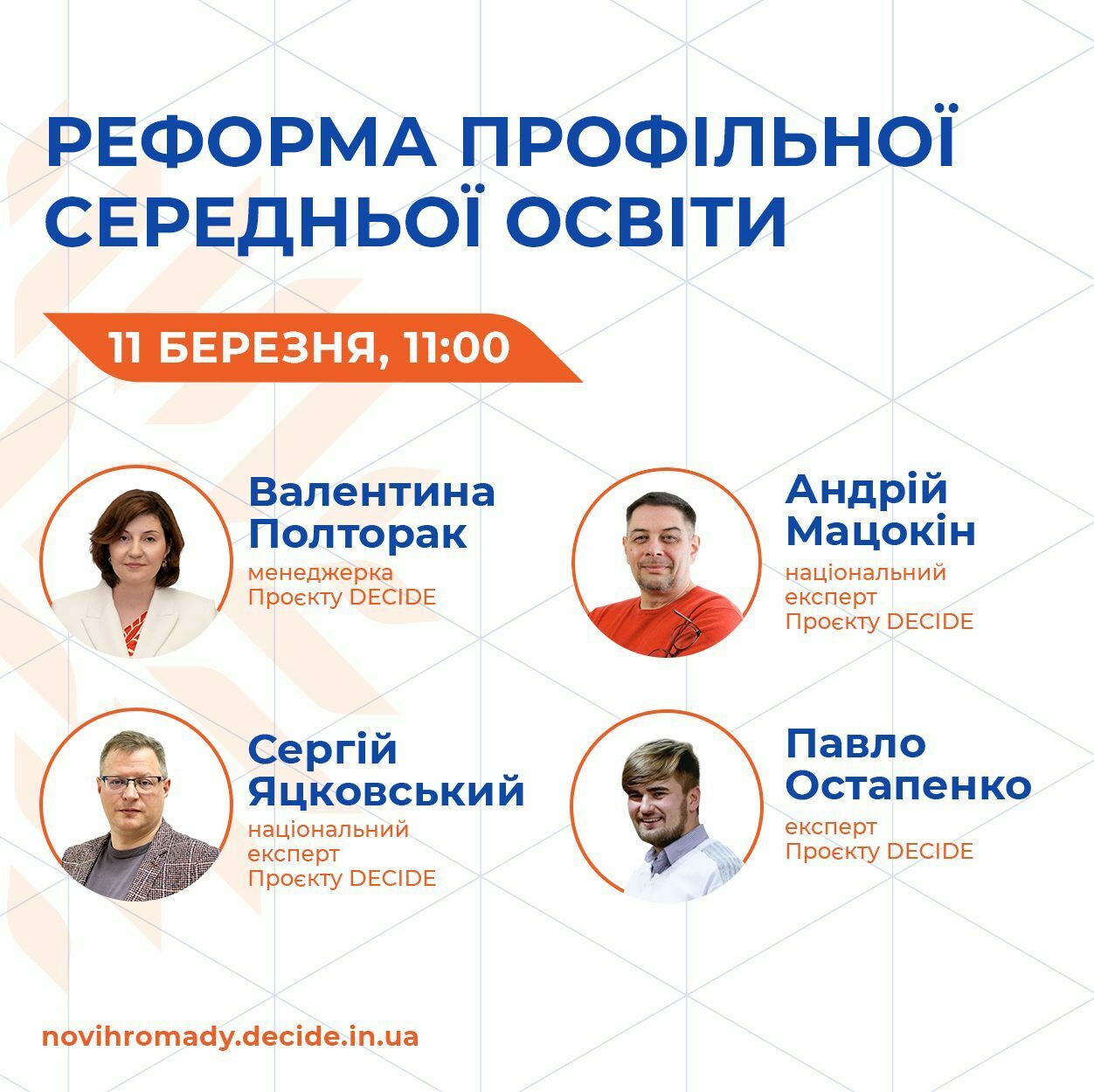 11 березня 2025 року о 11:00 розпочнетьсяна вебінар «Реформа профільної середньої освіти», де експерти Швейцарсько-українського проєкту DECIDE поділяться практичними рішеннями щодо: