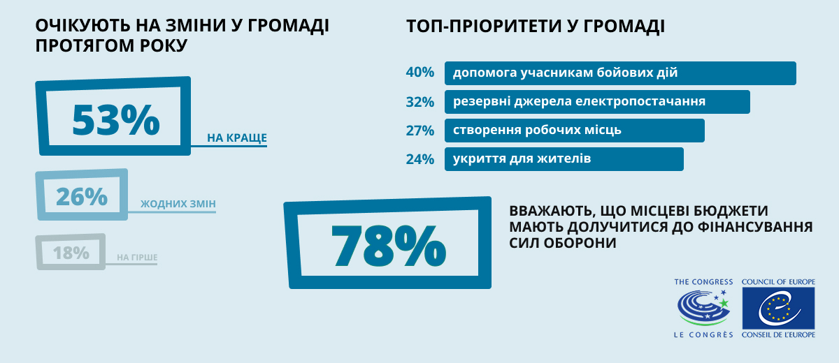 Населення України адаптується до реалій війни і, попри небезпеки та втрати, зберігає обережний оптимізм. Від керівництва громад люди в першу чергу очікують підтримки війська і військовослужбовців, а також - стабільного енергопостачання, створення робочих місць та забезпечення укриттями.