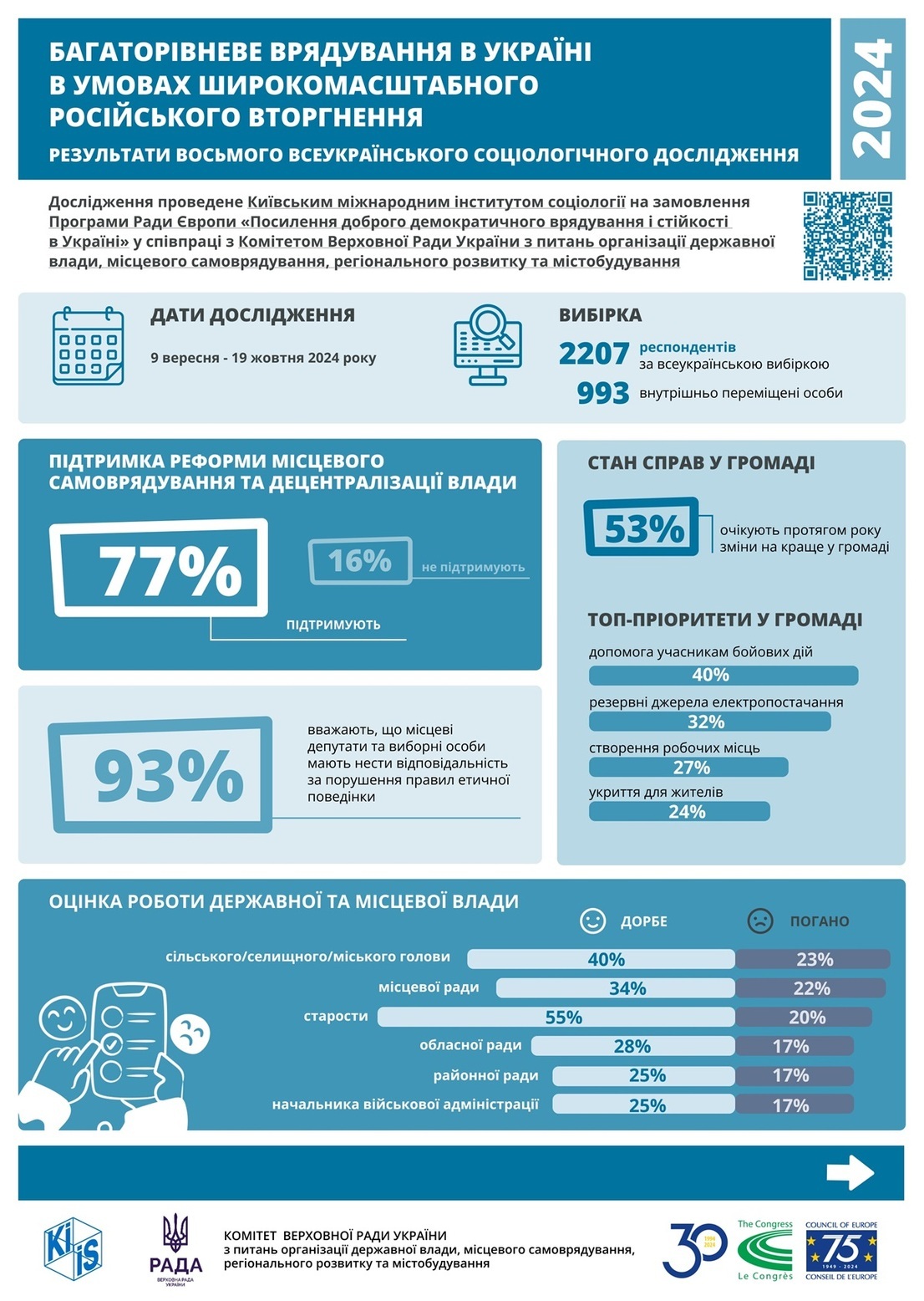 Про це свідчать результати восьмої хвилі всеукраїнського соціологічного дослідження «Багаторівневе врядування в Україні в умовах широкомасштабного російського вторгнення», яке провів Київський міжнародний інститут соціології (КМІС) на замовлення Ради Європи в рамках Програми «Посилення доброго демократичного врядування і стійкості в Україні» у співпраці з Комітетом Верховної Ради України з питань організації державної влади, місцевого самоврядування, регіонального розвитку та містобудування.