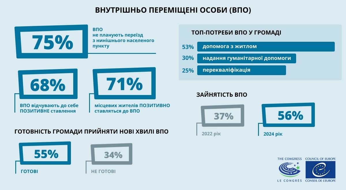 За результатами дослідження, 68% вимушено переміщених осіб відчувають позитивне ставлення до себе. При цьому, 71% опитаних місцевих жителів позитивно ставляться до ВПО, а 55% вважають, що їхні громади готові прийняти нові хвилі ВПО (34% - не готові).