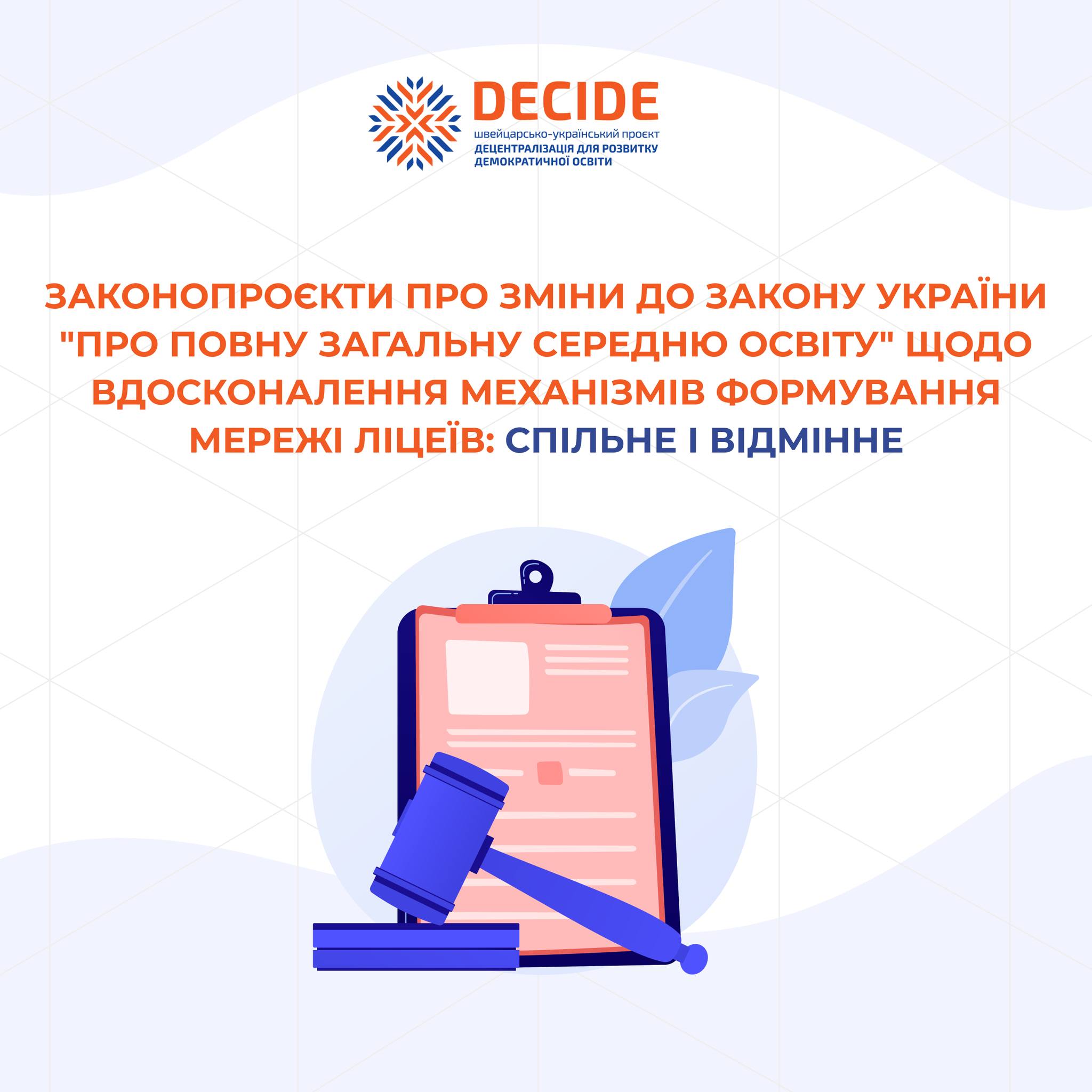 У чому відмінність цих документів? Щоб допомогти освітянам, батькам та управлінцям краще зрозуміти, що пропонує кожен із законопроєктів, експерти Швейцарсько-українського проєкту DECIDE підготували інфографіку.