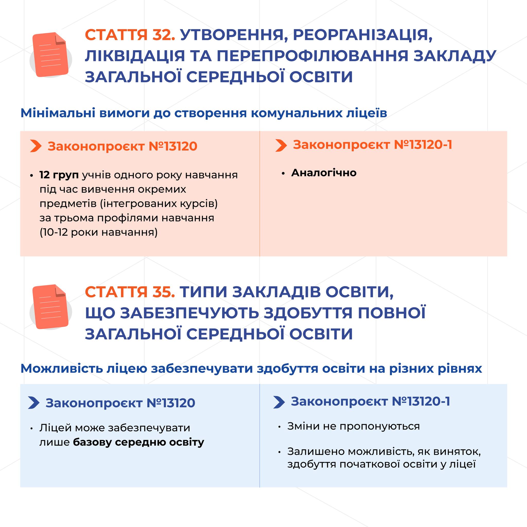 У Верховній Раді України зареєстровані два законопроєкти народних депутатів, спрямовані на трансформацію мережі закладів освіти: №13120 та №13120-1 з однаковою назвою «Про внесення змін до Закону України "Про повну загальну середню освіту" щодо вдосконалення механізмів формування мережі ліцеїв».