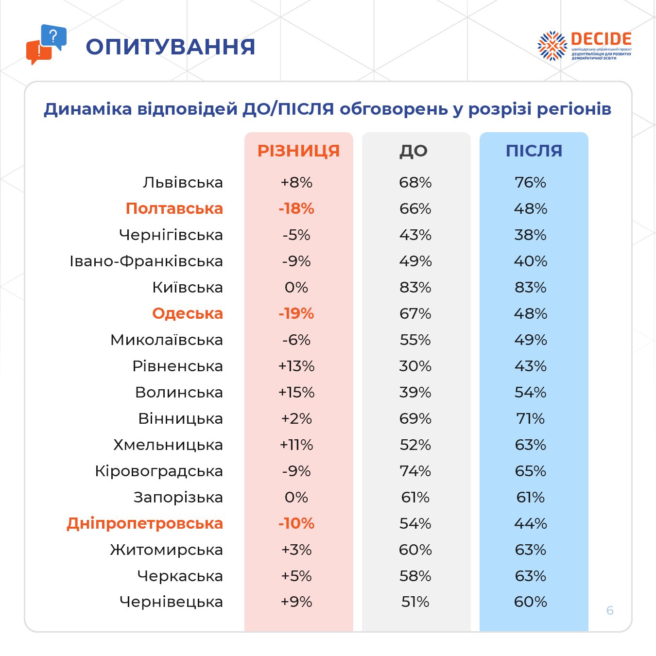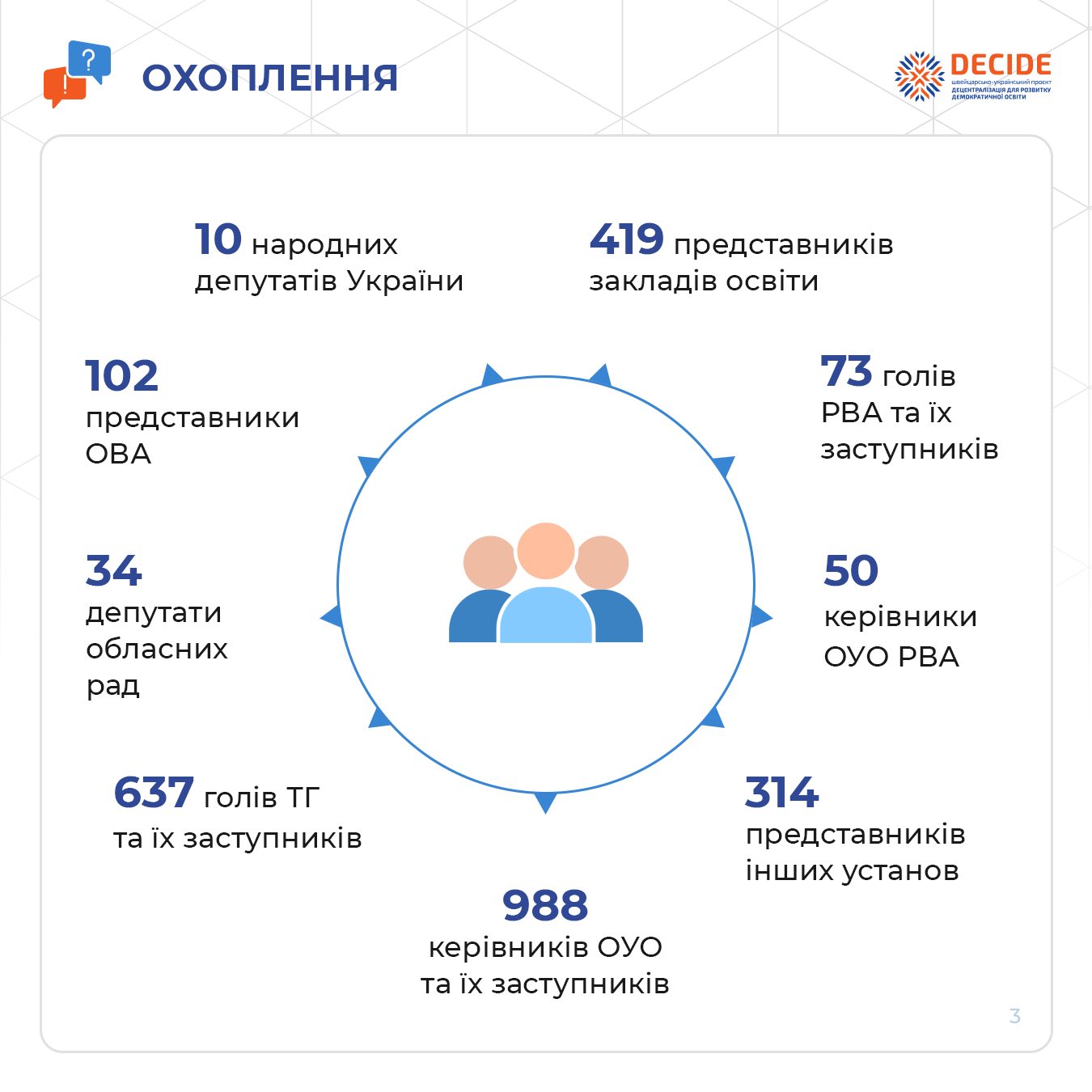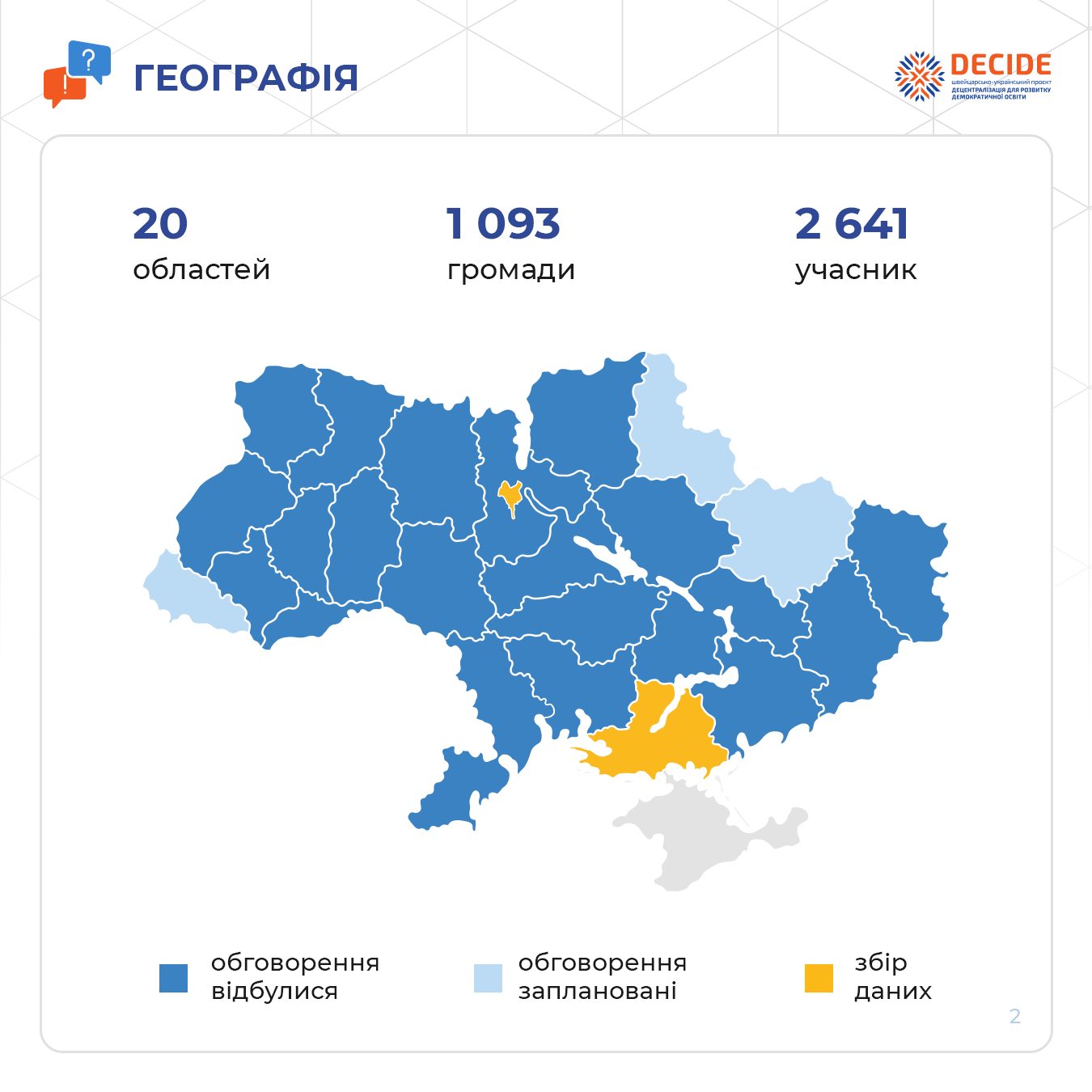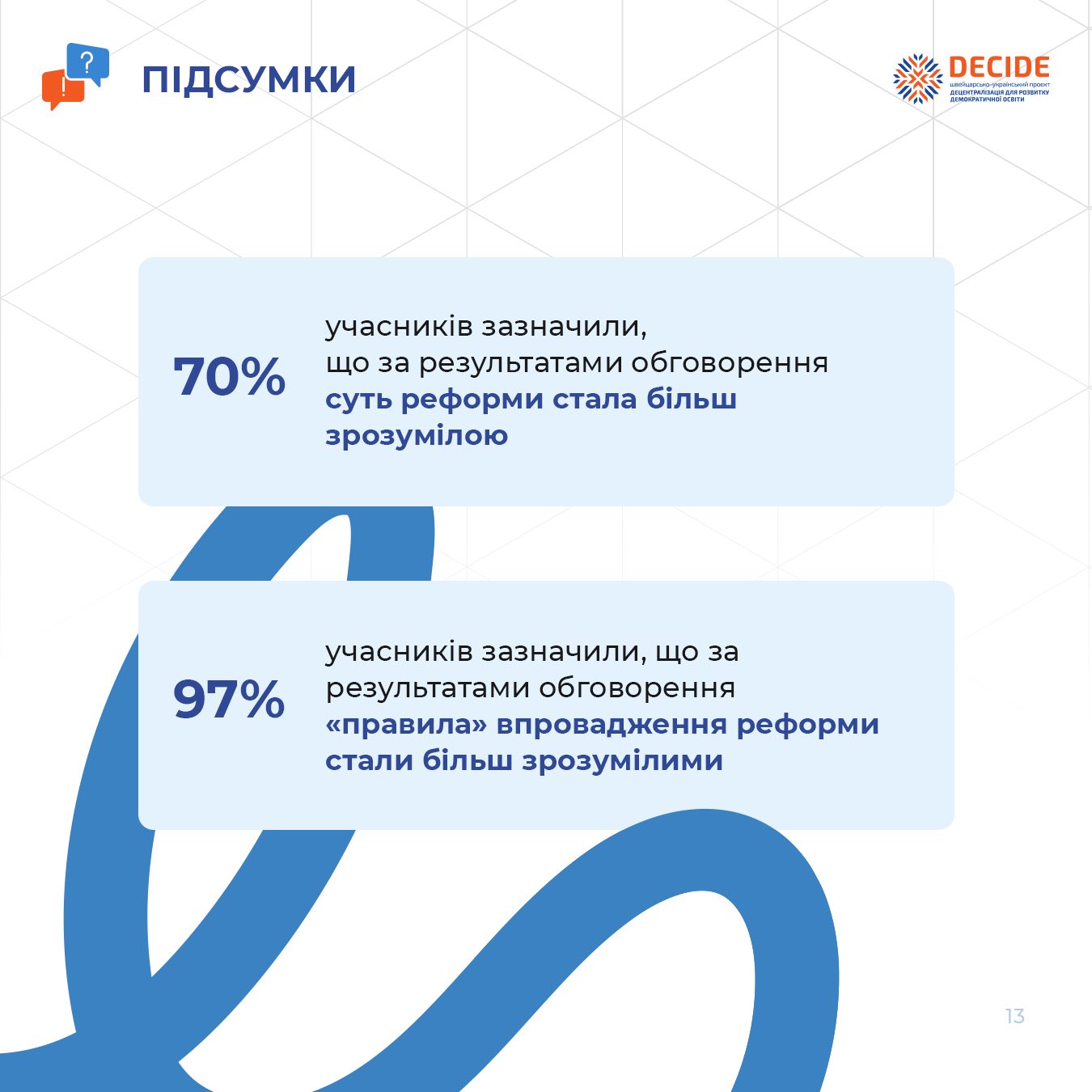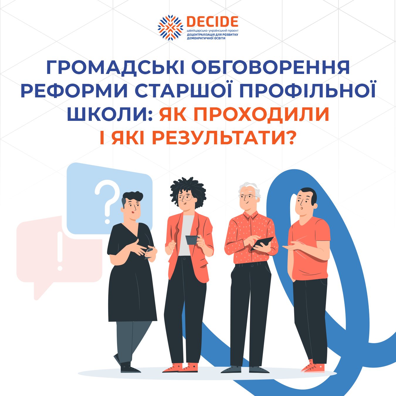 20 областей, 1093 громади і понад 2600 респондентів — від народних депутатів та представників ОВА, РВА до голів громад, керівників ОУО та закладів освіти. Про що говорили і які результати громадських обговорень реформи старшої профільної школи — у інфографіці від Швейцарсько-українського проєкту DECIDE.
