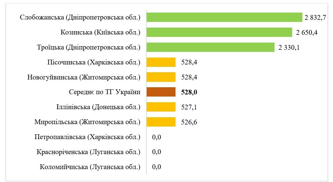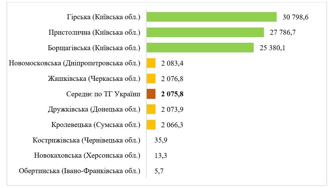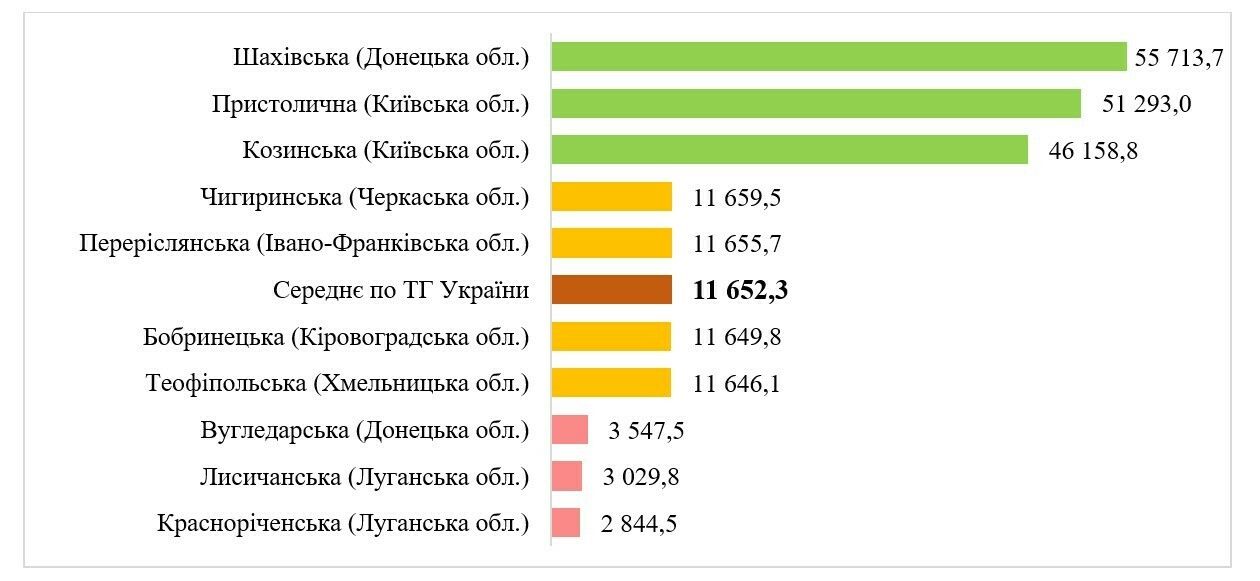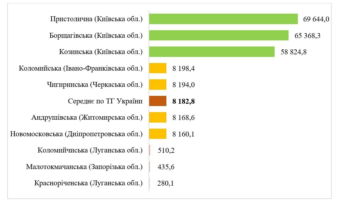 Аналіз узагальнених фінансових показників свідчить про суттєву диференціацію у ресурсному забезпеченні серед територіальних громад та значного впливу повномасштабної війни на їх фінансову спроможність. Наприклад, серед громад найвищий та найнижчий показники доходів на 1 мешканця відрізняється майже у 250 разів, видатки – у 20 разів. Також проведений аналіз свідчить, що в окремих громадах частка видатків на оплату праці працівників бюджетної сфери є надто високою, іноді понад 80% чи 90% від усіх видатків. Це, відповідно, звужує їхні можливості для фінансування інших, у тому числі капітальних видатків. Слід звернути увагу, що зважаючи на бойові дії, і у зв’язку з цим неможливістю проведення економічної діяльності та належного наповнення дохідної частини місцевих бюджетів, у деяких прифронтових територіальних громадах обсяг видатків на управлінський апарат перевищує обсяги власних доходів. В окремих територіальних громадах великий обсяг видатків на управлінські витрати зумовлений їх невеликим розміром та малою чисельністю.